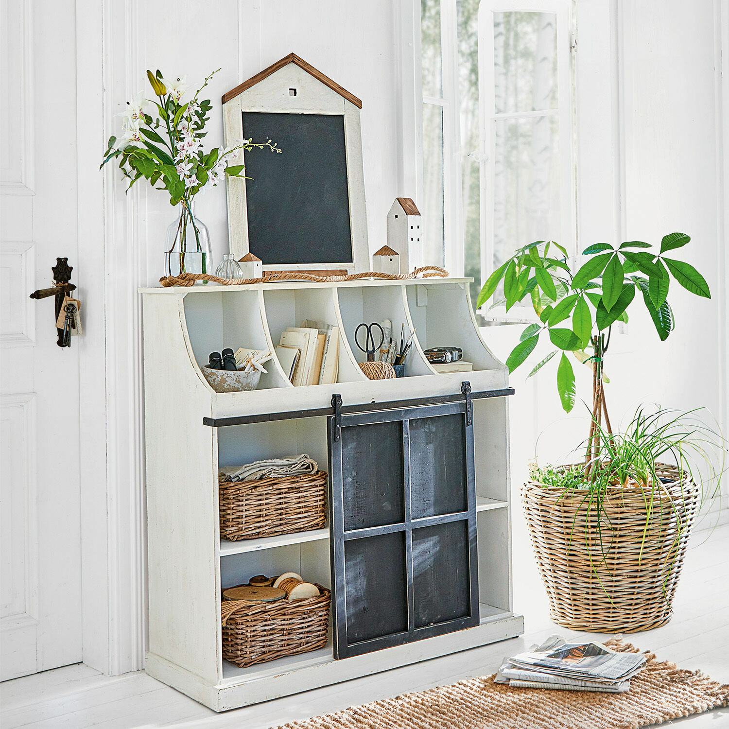 Die elegante Kommode bietet viel Platz für Ihre Gegenstände des täglichen Bedarfs, für Bastel- oder Büromaterialien, ihre liebsten Gestecke oder auch für hübsche Dekorartikel, die Ihr schönes Zuhause noch ein wenig schöner machen. Hier findet alles seinen rechten Platz und wird umrahmt von einem eleganten Design. Weiteres Plus: die schöne Schiebetür aus Holz, die durch ihre schwarze Lackierung für einen besonders reizvollen optischen Akzent sorgt und das Ordnungstalent durch ein faszinierendes spielerisches Element aufwertet. All dies, dazu die vielen feinen Fächer und die stilsichere Kombination von geraden und gerundeten Designlinien machen dieses liebenswerte Schmuckstück zu einer wahrhaften Zierde, an deren Anblick Sie stets Ihre Freude haben werden.