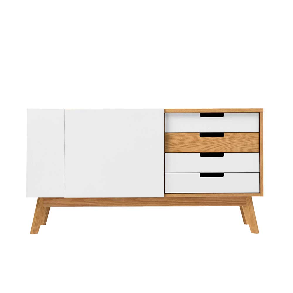 – Sideboard Weiß und Eichefarben – Wohnzimmerschrank Eiche Massivholz, MDF und Spanplatte – Kommode Skandi Design – Sidebord Breite: 135 – Küchenkommode Höhe: 71 – Kommode holz Tiefe: 47 – Kommode massivholz Mit vier Schubladen und mit Metallauszug – Wohnzimmer schrank Schrank-Tür: mit Dreh- und Schiebetüren – Wohnzimmer kommode 2-türig, Innenaufteilung: mit Einlegeböden – Kommode massiv Ohne Beleuchtung – Kommode echtholz Zerlegt, zum leichten Selbstaufbau (Montageanleitung liegt bei) – Echtholz kommode 4-Fuß Gestell aus Massivholz – Große kommode Furniert und Lackiert – Esszimmer kommode Griffmulden – Kommode vollholz Rechteckige Form – Massivholzkommode Holzwerkstoff Tür – Wohnzimmerkommode Griff Form: Griffloch