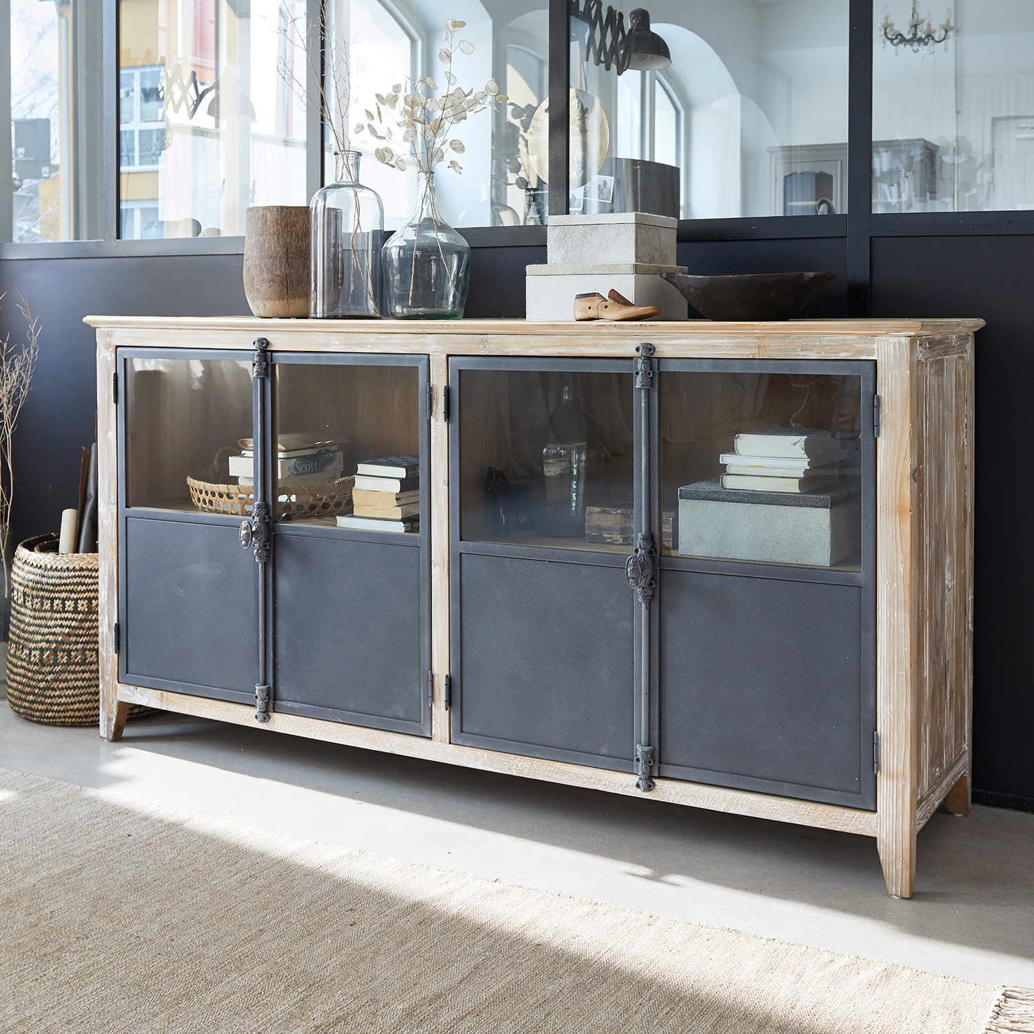 Eine Kombination, wie man sie nicht alle Tage sieht: Hier verbindet sich wiederaufbereitetes Tannenholz mit starken Eisenelementen und Glas. Die klare Formgebung sorgt für einen puristischen Farmhouse Look, der in jedem Raum zum Blickfang wird. Das Tannenholz mit White-Wash-Finish besticht durch seine individuellen Maserungen und gibt dem Schmuckstück einen nachhaltigen Charakter. Aufgrund ihrer Größe und Belastbarkeit ist die Kommode ideal zur Aufbewahrung oder Präsentation insbesondere schwerer Objekte oder Dekorartikel geeignet. Hier findet alles seinen Platz – egal ob es sich um hübsche Pflanzentöpfe oder farbenfrohe Blumen handelt, um schicke Sammlerstücke oder um Materialien von Profi- oder Hobbykreativen. Außergewöhnlich schöne Gegenstände können Sie on top auf die Ablage stellen oder hinter die Glaselemente der Türen, die übrigens über einen raffinierten Schließmechanismus verfügen. Fest steht: Diese Konsole wird Sie über viele Jahre hinweg begeistern.