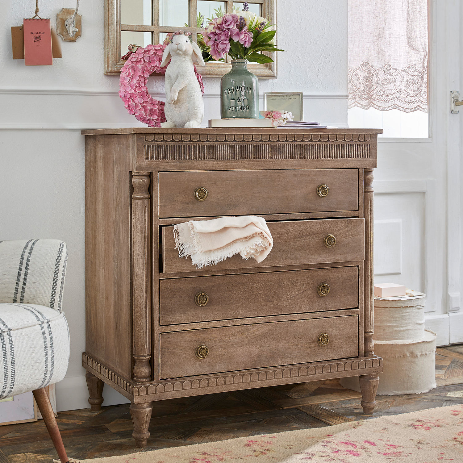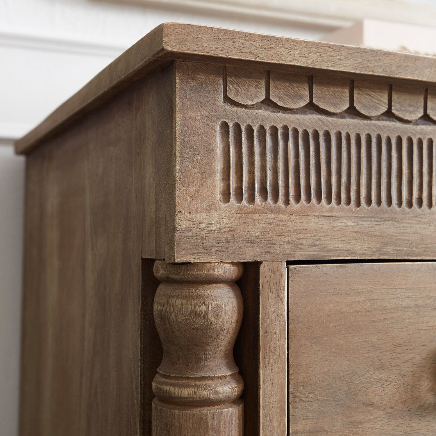 Es gibt Kommoden, die beschränken sich darauf, praktischen Stauraum zu bieten. und es gibt Kommoden, die haben den Ehrgeiz, das vielbewunderte Highlight im Raum zu werden. Eine solche Starrolle ist dieser Kommode quasi auf den Korpus geschrieben, denn sie ist ein Meisterwerk der traditionellen Möbelkunst. Immer wieder entdeckt man ein weiteres, liebevoll bearbeitetes Detail, mit dem das massive Mangoholz verziert ist. So rahmen zwei stattliche Säulen die Schubladen stilvoll ein, während klassisch anmutende Ornamente den oberen und unteren Kranz schmücken. Von Hand gedrechselte Füße runden schließlich die erlesene Erscheinung der Kommode ab. Ihre außergewöhnliche Raumwirkung resultiert aber nicht nur aus der aufwendigen Verarbeitungsweise, sie ist auch der edlen Wirkung des Mangoholzes geschuldet. Mangoholz ist gerade bei Kunsthandwerkern sehr beliebt, denn es ist stabil, langlebig und lässt sich gut bearbeiten. Außerdem ist es als Nebenprodukt des Obstanbaus ein ökologisch wertvolles und nachhaltiges Naturmaterial, das besonders schön zum naturnahen Landhaus-Stil passt. Bei dieser Kommode unterstreicht das dunkle Finish den antiken Charakter des Möbelstücks. Doch bei allen optischen Vorzügen kann die Kommode auch mit praktischen Eigenschaften aufwarten. Die vier geräumigen Schubladen mit den stiltypischen Messinggriffen bieten Stauraum für viele Dinge, je nachdem, wo die Kommode bei Ihnen stehen wird.