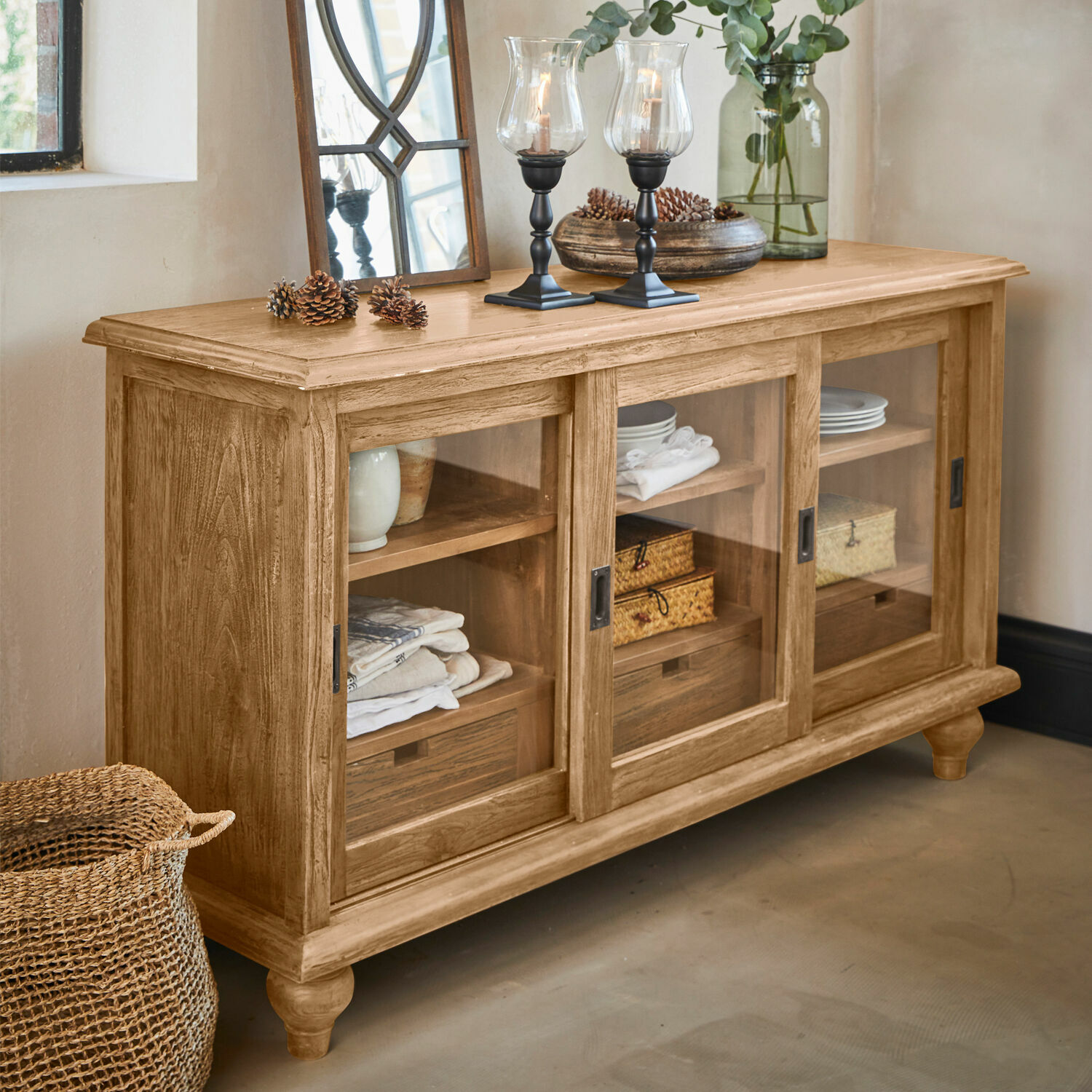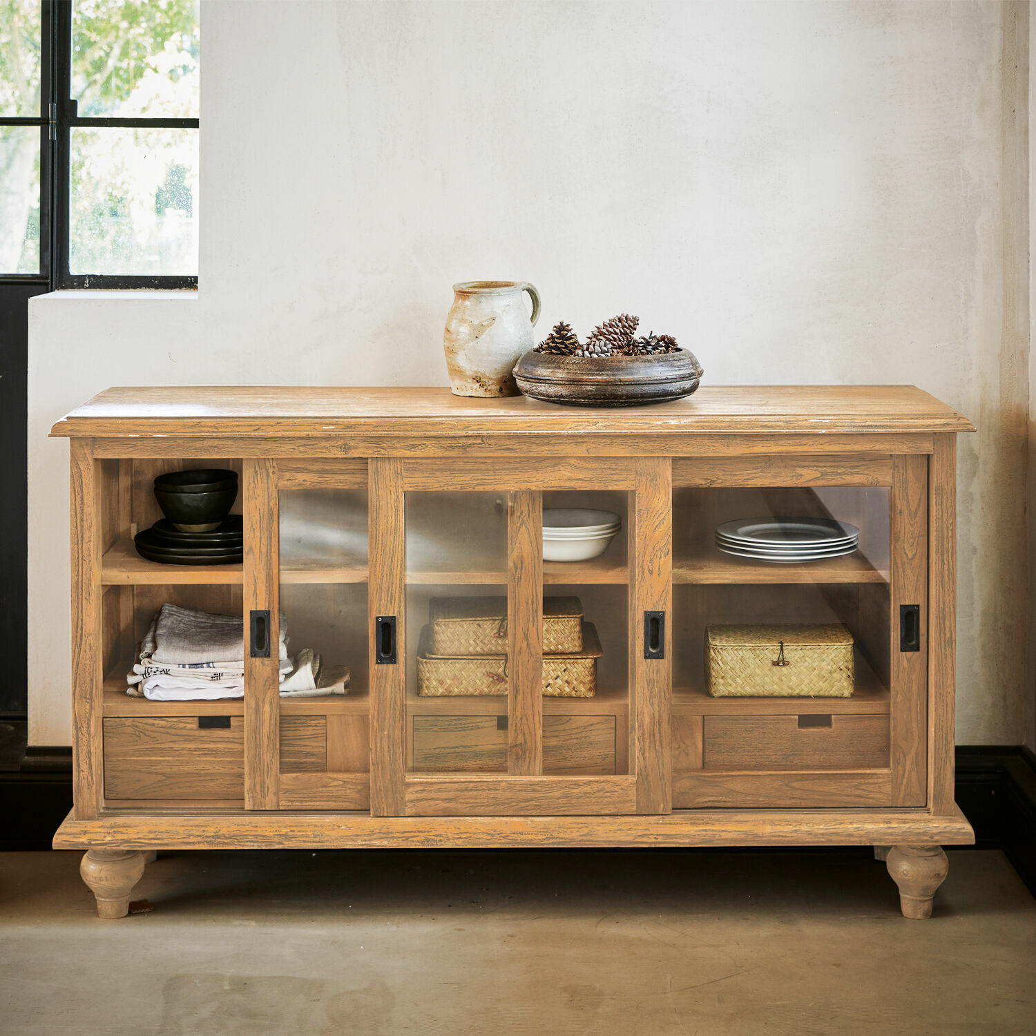 Holz ist seit jeher das beliebteste Material für den Bau von Möbeln. Ambitionierte Designer haben jetzt aber ein neues Lieblingsmaterial für ihre Kreationen entdeckt: Holz mit Geschichte. Und je älter das Holz ist, umso mehr Geschichten kann es erzählen von seinem früheren Leben als Haus, Boot oder Fußboden. Und wenn diese Hölzer dann in einem sorgfältigen Prozess wiederaufbereitet werden, verfügen sie über eine Aura, von der junges Holz nur träumen kann. Diese einzigartige Ausstrahlung wird sich auch Ihnen mitteilen, wenn Sie bald die Schiebetüren der Kommode öffnen, um das Geschirr herauszuholen, auf den Esstisch zu stellen und nach der Mahlzeit wieder einzuräumen. Während das Besteck, die Servietten und vieles andere in den Schubladen auf seinen Einsatz wartet. Dank der Schiebetüren, die auch geöffnet nicht im Wege stehen, kann die Kommode ausgezeichnet auch in kleineren Räumen oder schmalen Durchgängen platziert werden. Mit dieser Kommode haben Sie nicht nur ein außergewöhnlich schönes Möbelstück entdeckt, sondern auch eines, das gelassen in die Zukunft schaut. Denn erstens wurde es in bester Handwerkstradition gebaut und zweitens ist wiederaufbereitetes Teakholz eines der robustesten Edelhölzer, so dass die Kommode locker auch späteren Generationen als stilvoller Aufbewahrungsort dienen kann.