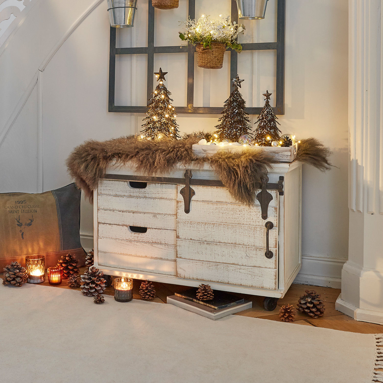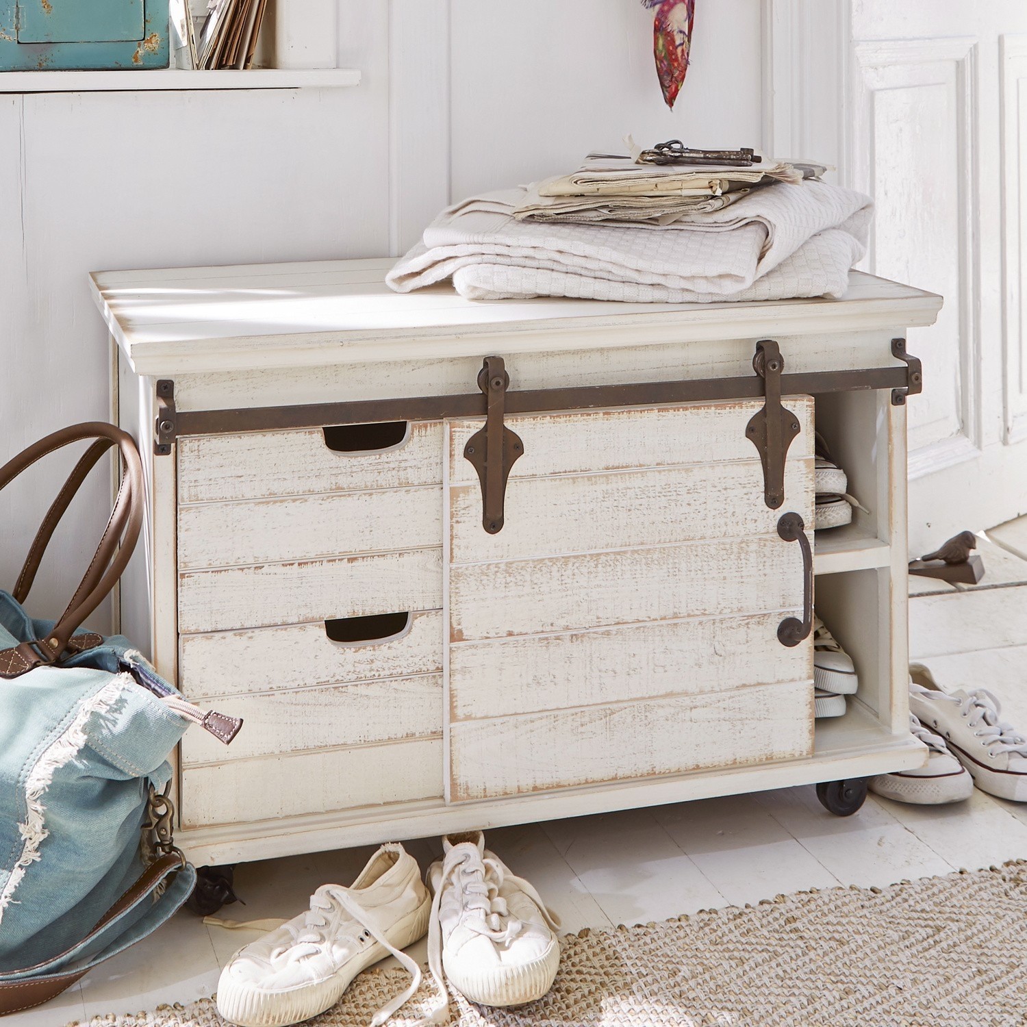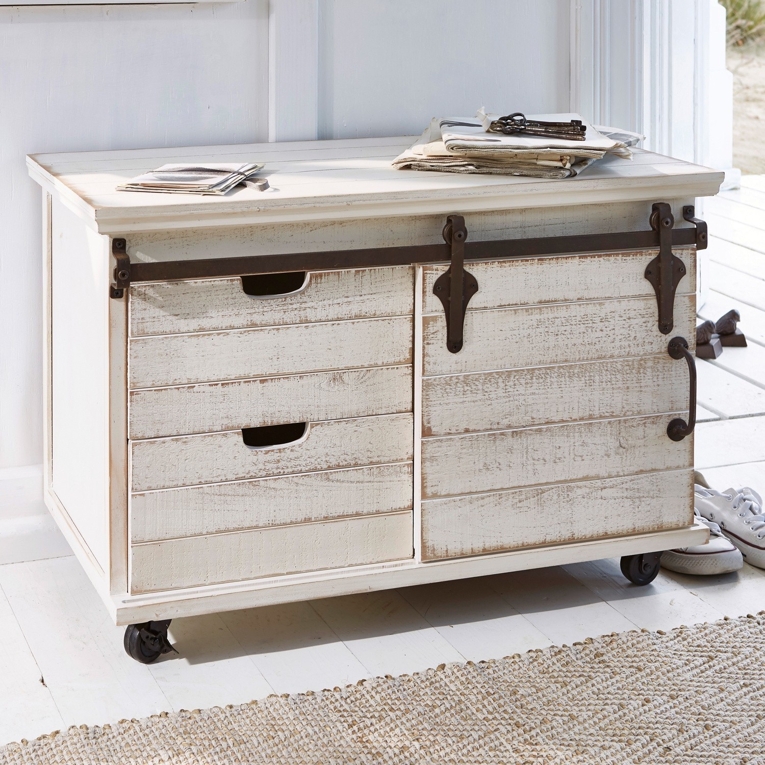 Ein charaktervolles Design mit hübscher Patina, das ganz authentisch und wie aus früheren Zeiten wirkt. Kunstvolle Beschläge aus Eisen zieren den stabilen Korpus aus Kiefernholz. Shabby-Chic deluxe! Setzen Sie einen harmonischen optischen Akzent und nutzen Sie das schöne Stück, um ganz einfach Ordnung zu halten. Zwei Schubladen und eine Schiebetür, hinter der sich ein fixierter Einlegeboden verbirgt, bieten viel Stauraum, ob für Geschirr, Textilien, Papiere oder andere Dinge. Hiermit holen Sie sich eine Extraportion nostalgischen Charme in Ihr Zuhause. Stabile Qualität im attraktiven Materialmix, an der Sie lange Freude haben werden.