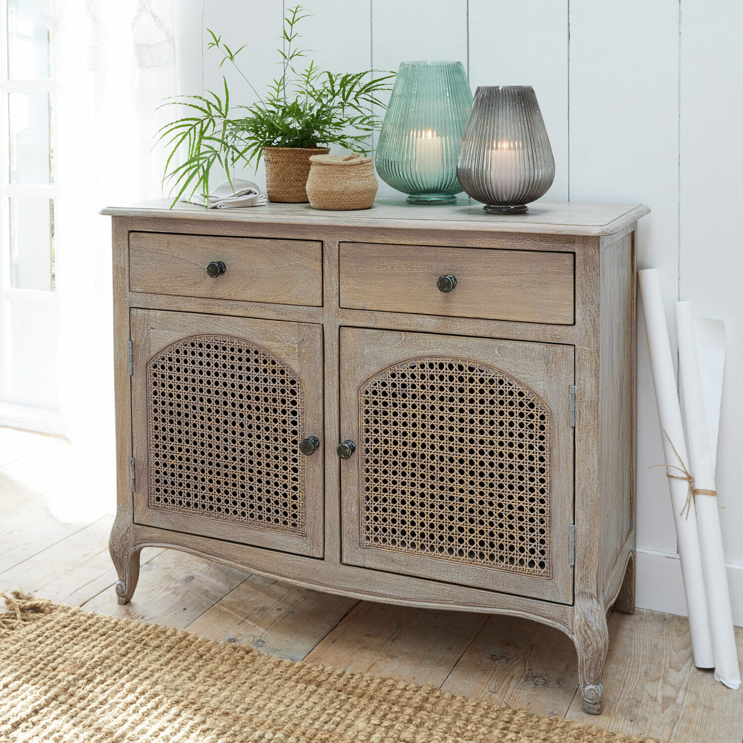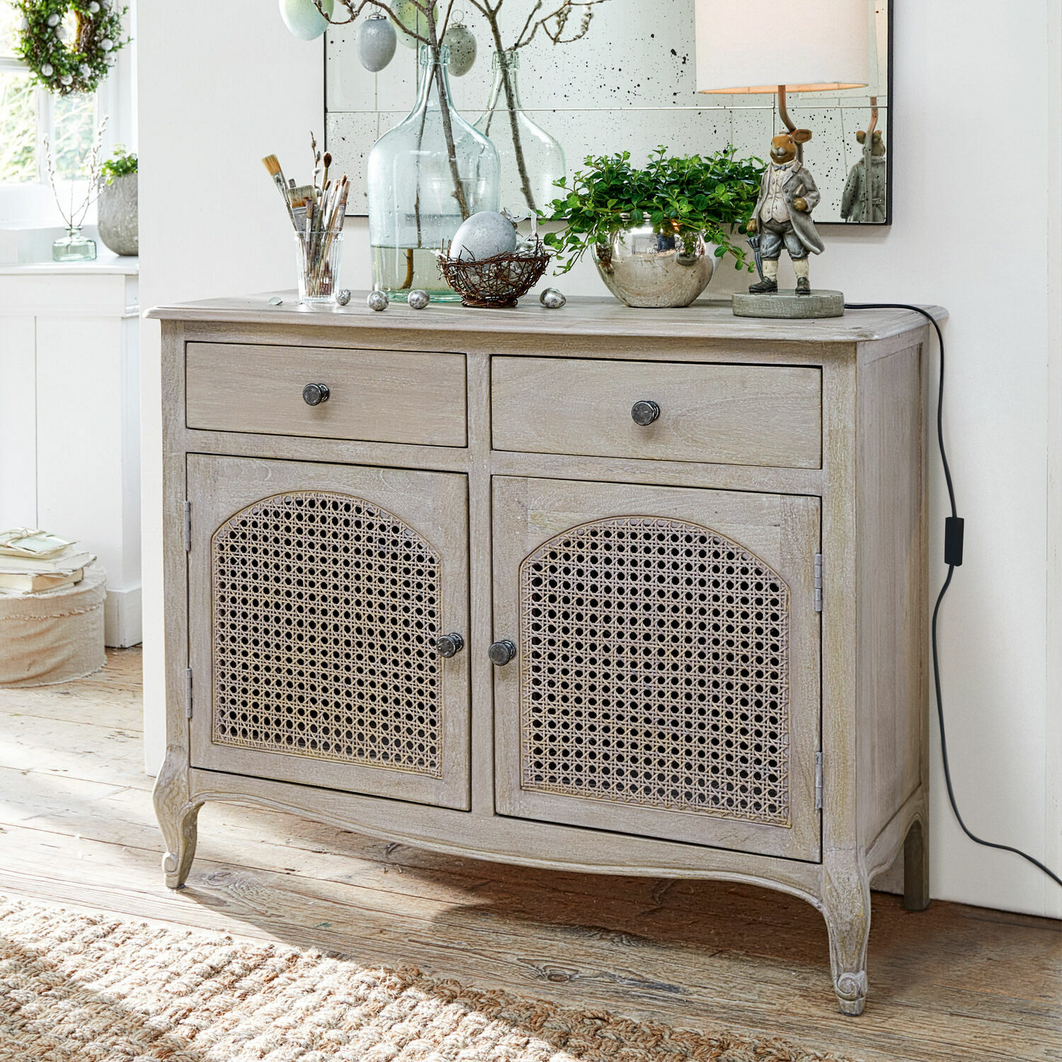 Manchmal ist es Liebe auf den ersten Blick. Wenn man schon im ersten Moment erkennt, dass man gerade etwas ganz Besonderes entdeckt hat. Zum Beispiel eine Kommode, die ein Meisterwerk traditioneller Handwerkskunst und eine bezaubernde Bereicherung Ihres Wohn-Interieurs ist. Zwei natürlich schöne Materialien verleihen der Kommode den nostalgischen Charme, der auch in Ihrem Wohn-Interieur sofort spürbar sein und für eine heiter beschwingte Stimmung sorgen wird. Das massive Mangoholz zeigt nicht nur die typische Maserung, sondern erfreut auch mit den zierlich gearbeiteten Füßen, der geschwungenen Linienführung und den sanft abgerundeten Kanten das Auge des Betrachters. Während die gewachste Oberfläche eine gute Alltagstauglichkeit garantiert. Was für viele Freunde des klassischen Landhaus-Stils aber ebenso wichtig ist wie eine gelungene Optik: Mangoholz ist ein Nebenprodukt des Obstanbaus und somit ein nachhaltiges und umweltfreundliches Holz, das außerdem über eine lange Haltbarkeit verfügt. Das zierliche Wiener Geflecht, das seine Karriere als Sitzfläche berühmter Kaffeehausstühle begann, ist ebenfalls ein wertvolles Naturmaterial, das eine filigrane Erscheinung mit außergewöhnlicher Stabilität verbindet. Bei dieser Kommode bildet es einen interessanten Kontrast zu dem massiven Holz und verwehrt zugleich den Blick auf die Fächer hinter den Türen. Zwei praktische Schubladen und massive Messinggriffe runden den erlesenen Auftritt dieser Kommode stilvoll ab.