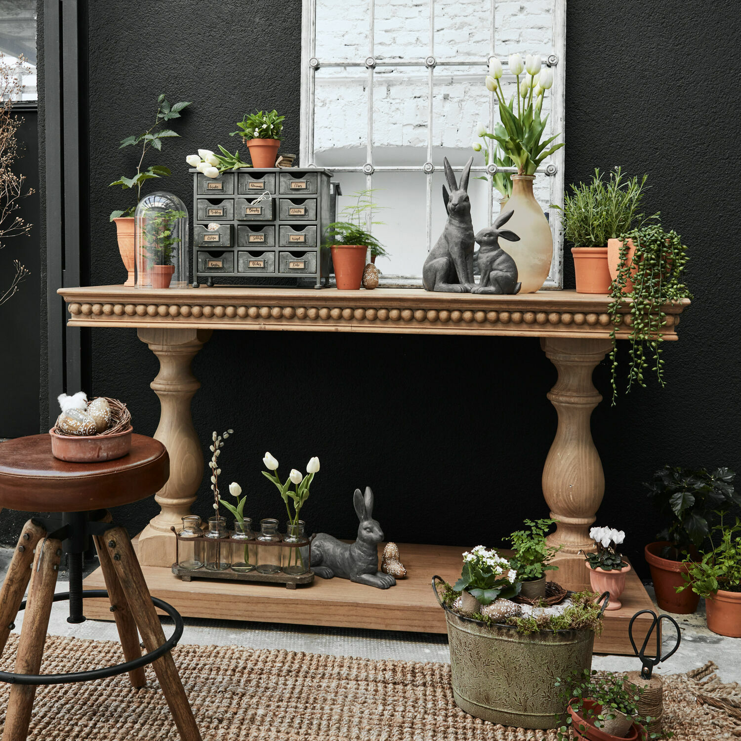 Wie schön, wenn man schon beim Betreten einer Wohnung von einer Atmosphäre stilvoller Wohnlichkeit empfangen wird! Wo schöne Möbel und ausgewählte Accessoires ein stimmiges Potpourri bilden und von der Passion des Eigentümers für wertvolle Naturmaterialien erzählen. In einem solchen Ambiente übernimmt oftmals eine Konsole wie diese hier eine tragende Rolle, die als praktische Ablage für die verschiedensten Dinge dient, zugleich aber ein Genuss fürs Auge ist. Gerne lässt man die Blicke über die vielen liebevoll gearbeiteten Details streifen – von den klassischen Perlstab-Schnitzereien, mit denen der Künstler den Rand der massiven Tischplatte verziert hat, bis zu den von Hand gedrechselten Beinen, die an die imposanten Säulen antiker Gebäude erinnern. Beide Beine sind massiv gearbeitet. Das schöne Kiefernholz wurde mit einem antibraunen Finish veredelt, das den antiken Charakter der Konsole zusätzlich betont.