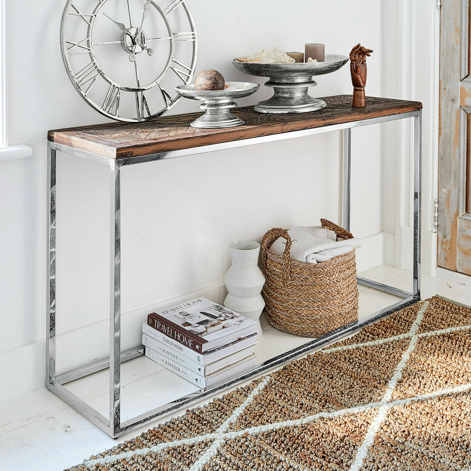 Präsentieren Sie Fotoalben, Ordner, Bücher, Geschirr oder andere Objekte und Gegenstände ganz faszinierend. Dekorieren Sie Ihr Wohnambiente mit dieser Konsole ganz nach Ihren Vorstellungen und Wünschen und lassen Sie den Charme des Schmuckstücks in Ihren Räumen wirken. Dank ihrer robusten Bauweise werden Sie an der Konsole sehr lange Freude haben. Denn ihr Korpus ist aus klarem, glänzendem Edelstahl und die Oberfläche aus hochwertigem, wiederaufbereitetem Salbaumholz, das durch seinen natürlichen Look begeistert. Fein gemasert, mit charakteristischen Farbschattierungen und kleinen Astlöchern begeistert hier Natur pur. Aufwendige Handwerkskunst ist in diesem stilvollen Objekt zu einem attraktiven Designerstück verarbeitet, das übrigens perfekt zu unserem Couchtisch 20609 passt. Freuen Sie sich auf ein echtes Unikat, das Sie so nirgendwo anders finden werden.