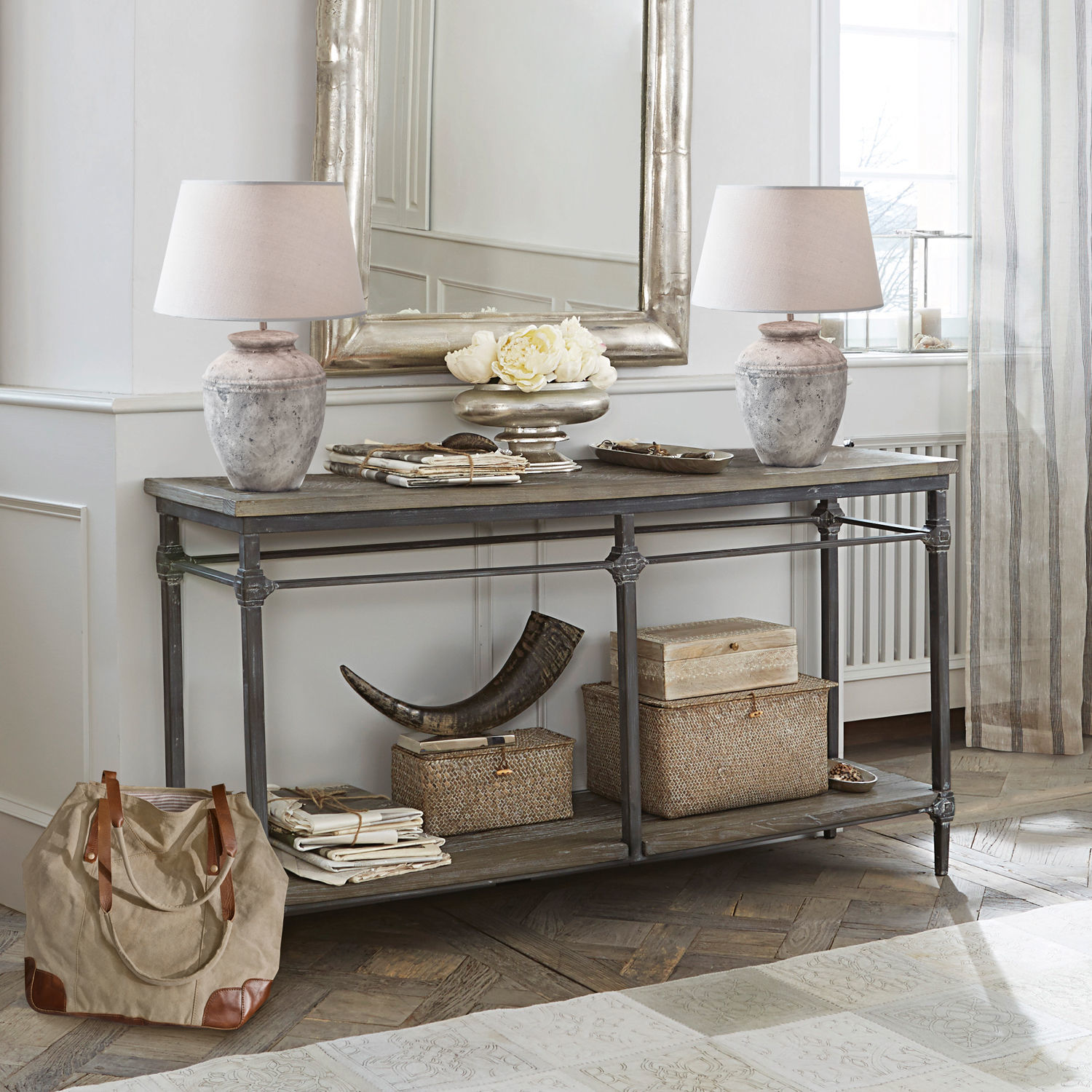 Ein Schmuckstück mit Intarsien im Stil von Fischgrät-Parkett mit White-Washed-Finish. Das Gestell aus Eisen weist ein geschmackvoll raues Finish auf. Ein luxuriöses […]