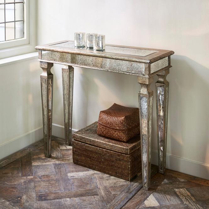 Mit einzigartigen, antik verspiegelten Glaseinsätzen versehen. Kunstvoll gearbeitetes Mangoholz. Mit antiksilbernem Finish im Vintage-Look überzogen. Ein Tisch aus […]