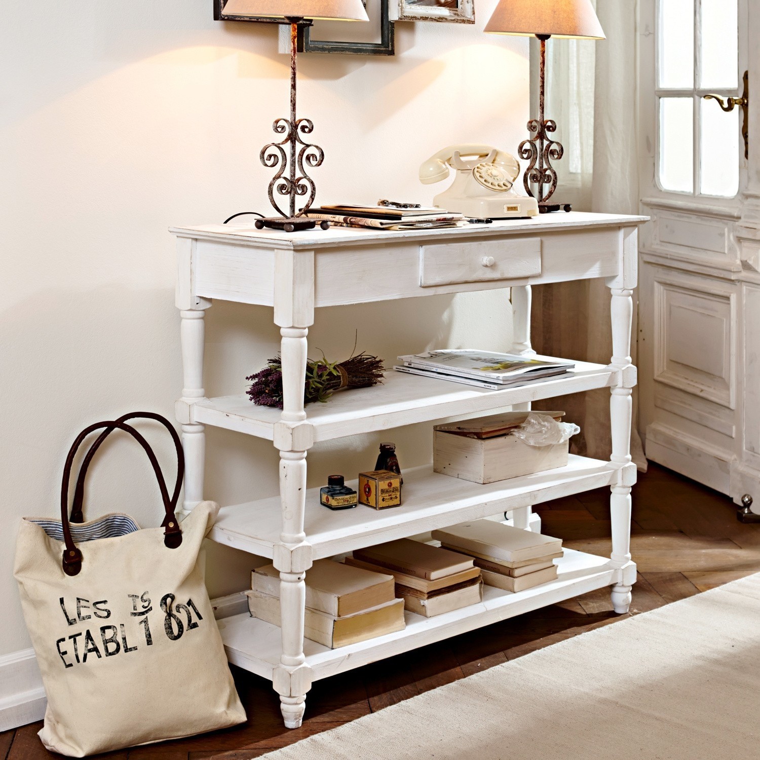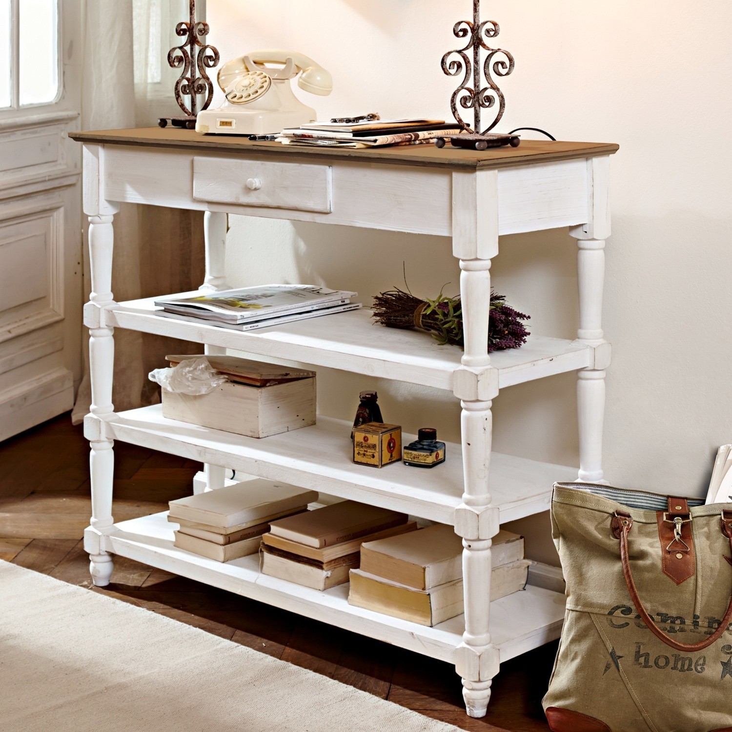Romantischer Konsolentisch mit gedrechselten Beinen und Schublade. Der antikweiß lasierte Konsoltisch im Landhausstil fühlt sich überall sofort zuhause: Ob im Bad, […]