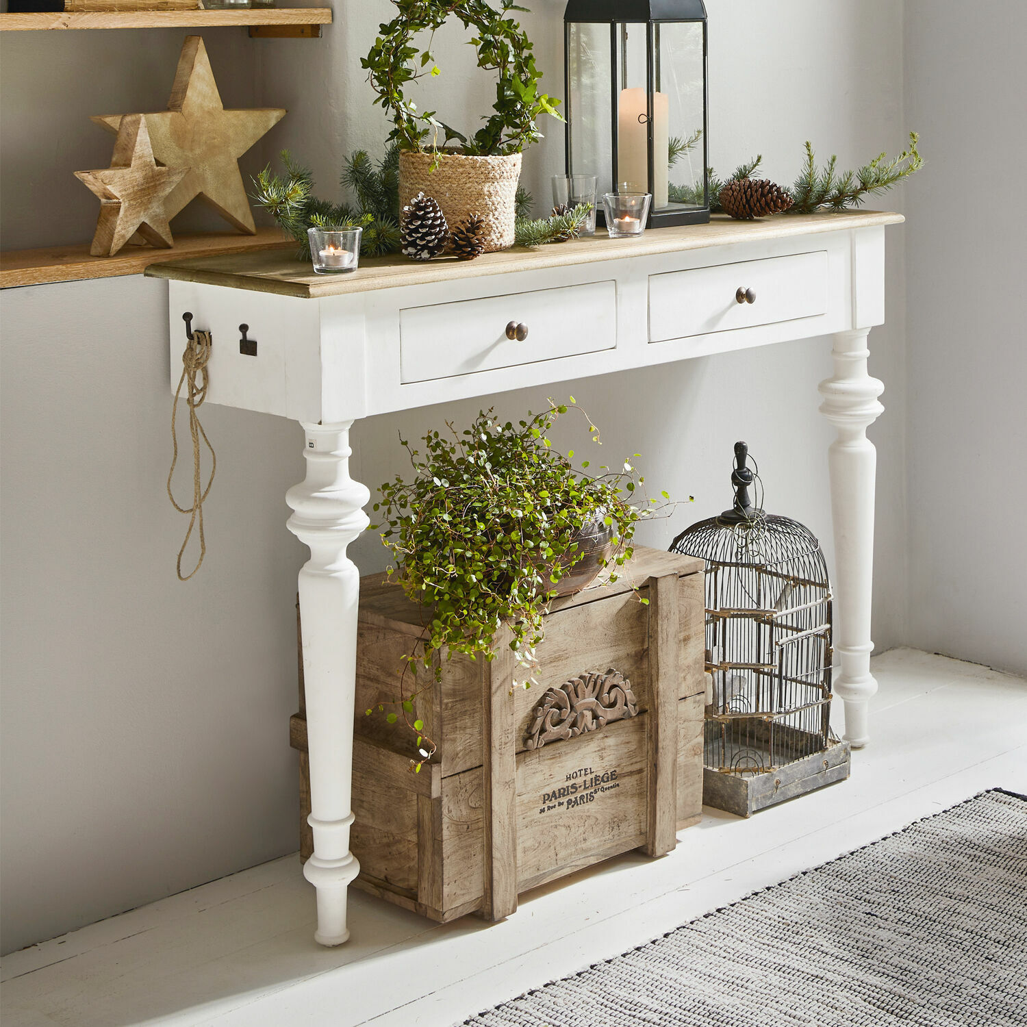 Konsolen blicken auf eine lange Tradition zurück und jede Epoche hat in diesen Möbelstücken ihre eigenen stilistischen Vorlieben verwirklicht. Diese Konsole wurde kunstfertig im Stil klassischer Landhausmöbel gefertigt, wie sie bis heute in französischen Landsitzen zu finden sind. Mit aufwendig von Hand gedrechselten Beinen, die man einfach bewundern muss. mit zwei Schubladen, deren typische Knebelgriffe ihr Pendant in den Haken an der Seite der Konsole finden. In den Schubladen und an der Hakenleiste können die verschiedensten Dinge verstaut werden, je nachdem, wo die Konsole bei Ihnen stehen wird. Sie sorgt im Eingangsbereich für ein stilvolles Entrée, sie ziert aber auch eine bisher kahle Wand im Wohn- oder Speisezimmer, wo dann vielleicht eine hübsche Tischlampe die feine Schreinerarbeit ins Licht rückt. Sogar wenn Sie einen kleinen, aber feinen Schminktisch fürs Schlafzimmer suchen, bietet die Konsole ihre Dienste an. Und das auf erstaunlich wenig Raum, denn wie ihre antiken Vorbilder hat die Konsole nur zwei Beine und wird zusätzlich an der Wand befestigt. Die frische Kombi aus Antikweiß und Naturholzton sowie die feinen Shabby-Akzente machen den stilvollen Landhaus-Auftritt perfekt.