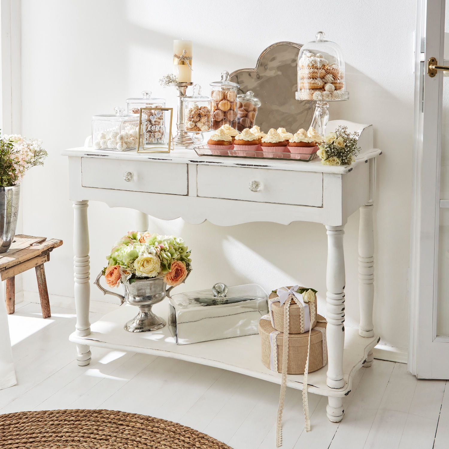 Ein Traum aus massivem Mangoholz für alle Freunde des Shabby-Chic. Mit bezaubernd gearbeiteten Details und schönem Antik-Finish erobert es sofort alle Herzen. Die wunderhübsche Formgebung mit geschwungenen Elementen im oberen Teil sorgt für romantisches Flair. Das gekonnte Antik-Finish vermittelt den Eindruck eines geliebten und gerne genutzten Stückes, das schon lange im Familienbesitz ist. Von den bezaubernden Beinen bis hin zu den Schubladengriffen wurde hier mit sehr viel Liebe zum Detail gearbeitet. In wirklich jedem Raum ein optisches Highlight, ob im Wohnzimmer, in der Diele oder im Schlafraum platziert. Auf der oberen Ablage lassen sich Blumen-Bouquets, Bücher, Kerzenhalter oder Bilderrahmen wunderbar arrangieren. Auf der unteren Ablage könnten gefaltete Wohndecken, Kuschelkissen oder ein einfacher geflochtener Korb Platz finden. In den beiden Schubladen finden kleinere Dinge wie Briefe, Notizbücher oder hübsche Fundstücke ihren Raum. Alle die romantische Möbelstücke mit Patina mögen, werden sich Hals über Kopf in diesen hochwertig massiven und doch so zarten Shabby-Traum verlieben