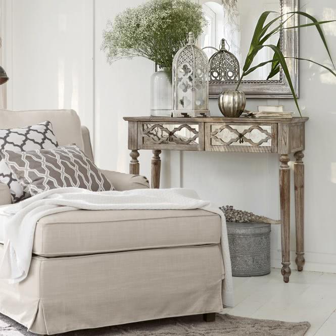 Aus wiederaufbereitetem Kiefernholz mit Antik-Finish und kunstvoll gerechselten Beinen. Die zwei Schübe haben Fronten aus antikem Spiegelglas, die zudem von […]