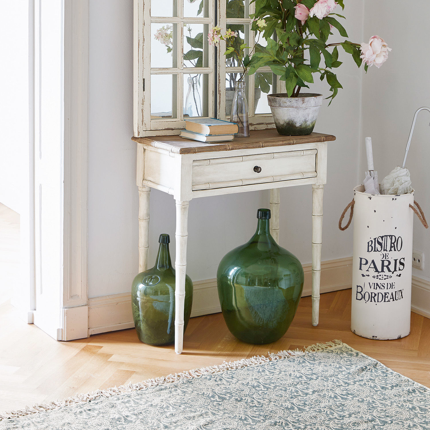 Manche Möbelstücke wirken gealtert einfach schöner. Also wartet man, bis die Zeit ihre Spuren hinterlässt oder hilft ein bisschen nach – wenn es zum Thema passt. Genau so geschehen ist das bei dieser eleganten Konsole aus massivem Mangoholz, deren antike Patina mit kleinen Abnutzungsspuren trendigen Shabby-Chic symbolisiert. Ihre Fertigung im Stil französischer Vorbilder stellt höchste Ansprüche an die Tischlerkunst. Die vier schmalen, aufwendig gedrechselten Beine strahlen dabei eine wunderbare Leichtigkeit aus. Auf Ihnen scheint der Korpus elegant zu schweben, in dem eine kleine Schublade mit gedrechselten Verzierungen integriert ist – wichtige Dinge des Alltags lassen sich darin schnell verstauen. Abgerundet wird der Tisch durch die naturbelassene Holzplatte, die ebenfalls mit kleinen Drechsel-Details veredelt wurde. Was für eine gelungene Kombination! Nicht zu ausladend in der Tiefe nimmt der Beistelltisch nur wenig Platz ein. So füllt er ideal kleine Nischen oder kommt auch in kompakten Räumen wie im Flur perfekt zur Geltung – und das mit viel Stil. Ein außergewöhnlicher Blickfang und wertvolle Ablage für Lampen, Deko-Objekte oder Blumenbouquets. So schön lässt sich Ästhetik mit Funktion verbinden.