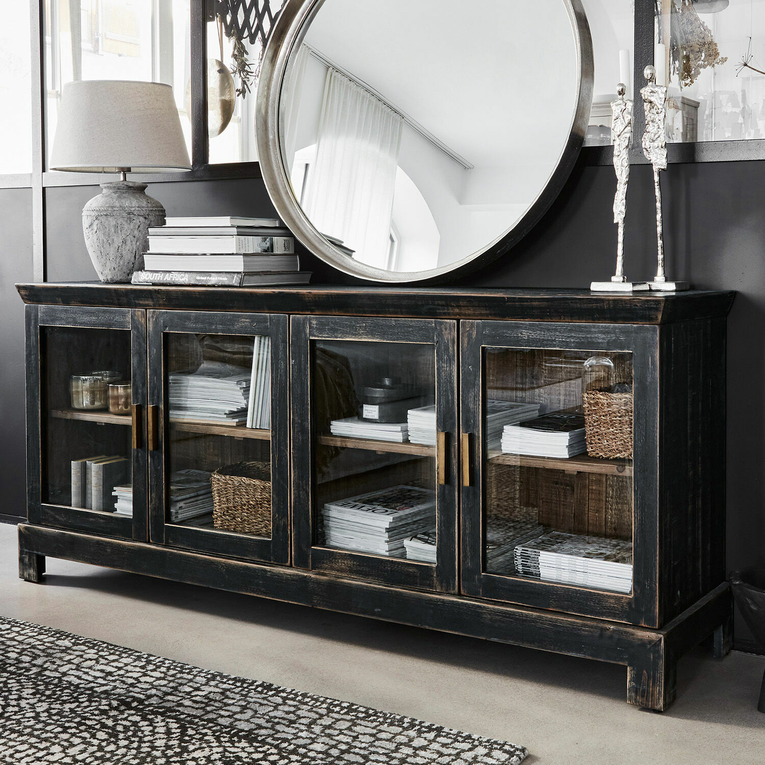 Sie scheint wie aus der Zeit gefallen: Diese schicke Konsole birgt mehr als nur ein Geheimnis. Dank ihres Used-Looks und Materials wirkt sie wie eine wertvolle Antiquität. Das Holz, aus dem sie gefertigt ist, erzählt seine eigene Geschichte. Denn das Schmuckstück wurde aus wiederaufbereitetem Tannenholz hergestellt. Ihr Material hat also schon gelebt – wie bei einer richtigen Antiquität. So ist die Kommode nachhaltig und gleichzeitig schmückend. Ihre historische Ausstrahlung wird noch unterstrichen von der naturbelassenen Innenseite des Möbelstücks. Die quadratischen Türen mit stilvollem Glaseinsatz schließen mit Hilfe eines Türdämpfers vorsichtig von alleine. So wird schnelles Zuschlagen verhindert und das Glas nicht beschädigt. Durch die Glastüren ist außerdem das Innenleben der Kommode gut sichtbar. Sie präsentiert Bücher, Kleidung, Ordner, Geschirr oder andere Gegenstände, die verstaut werden müssen, ganz wundervoll. Dekorieren Sie die Ablage ganz nach Ihren Wünschen oder lassen Sie einfach den Industrial-Charme der massiven Konsole in ihren Räumen wirken. Dank seiner robusten Bauweise werden Sie an ihr sehr lange Freude haben.