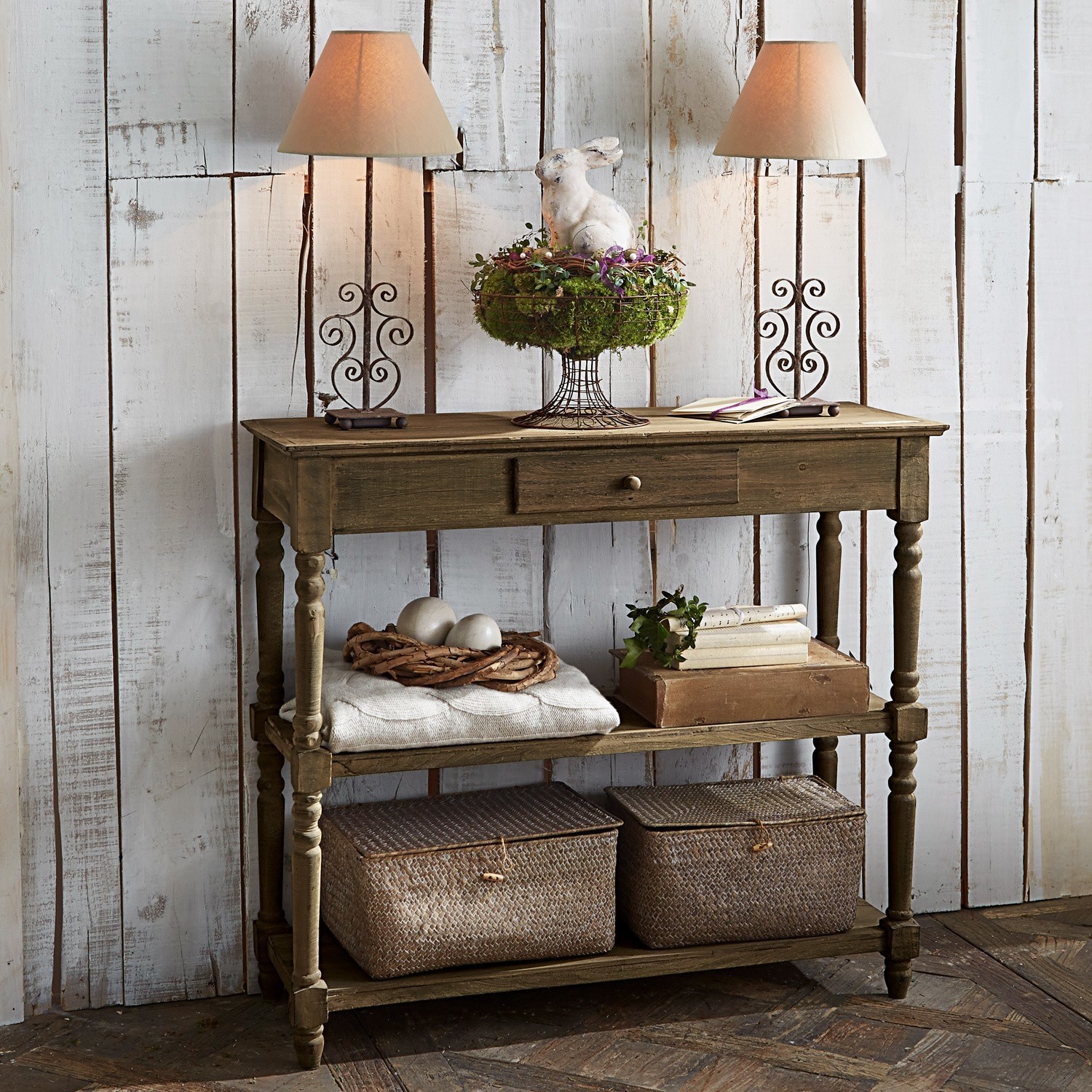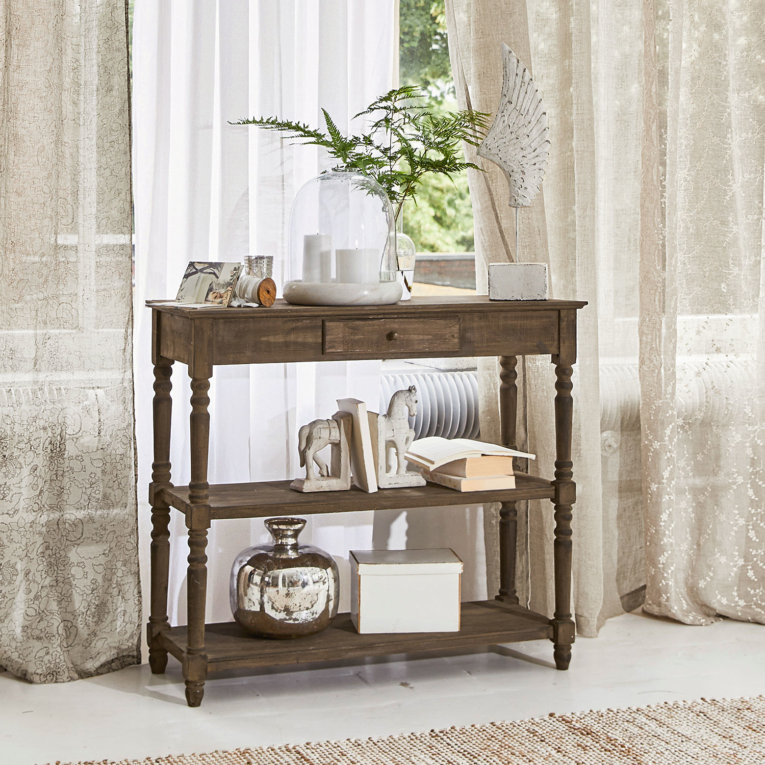 Aus Tannenholz mit Antik-Finish mit aufwendig gedrechselten Beinen, zwei Ablagen und einer Schublade. Mit einer Tiefe von gerade einmal 40 Zentimetern braucht die […]