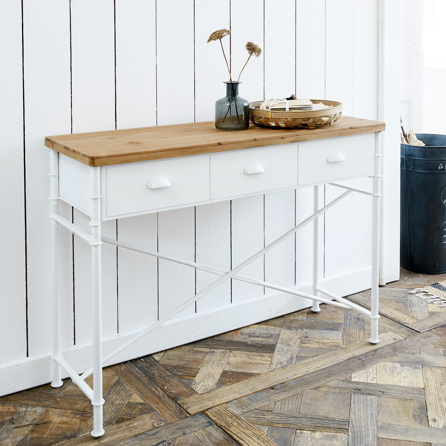 Material-Mix ist die Zauberformel, die aus dieser Konsole ein charakterstarkes Möbelstück zaubert, das sich in die verschiedensten Wohnsituationen einfügt. Und sich als kleines Möbel-Schmuckstück bei Ihnen beliebt machen wird. Sie kann wunderbar als Blickfang in Ihrem Flur platziert werden. Die große Ablagefläche bietet aber viel Platz für Ablagen und auch Deko und die drei darunter befindlichen Schubladen ausreichend Platz, um Schals, Mützen, Tücher und Co ordentlich und stilvoll unterzubringen. Doch die Konsole wäre nicht hier bei Loberon, wenn sie neben der praktischen Funktion nicht auch ein interessantes Design hätte. Vor allem die Kombi aus warmem Naturholz und Metall lässt diesen entspannten Look entstehen, mit dem die Konsole Sie und Ihre Gäste gleich im Eingangsbereich willkommen heißen wird. Aber so gut sie sich für das Entrée eignet, so ausgezeichnet kann sie im Speisezimmer als zierliche Alternative zu einer klassischen Anrichte eingesetzt werden oder im Wohnraum mit Pflanzen, einer schönen Tischlampe und jahreszeitlicher Deko für die individuelle Atmosphäre sorgen. Und lassen Sie sich nicht von dem filigranen Eisengestell in die Irre führen, es ist dank der Kreuzstreben stabiler, als Sie denken.