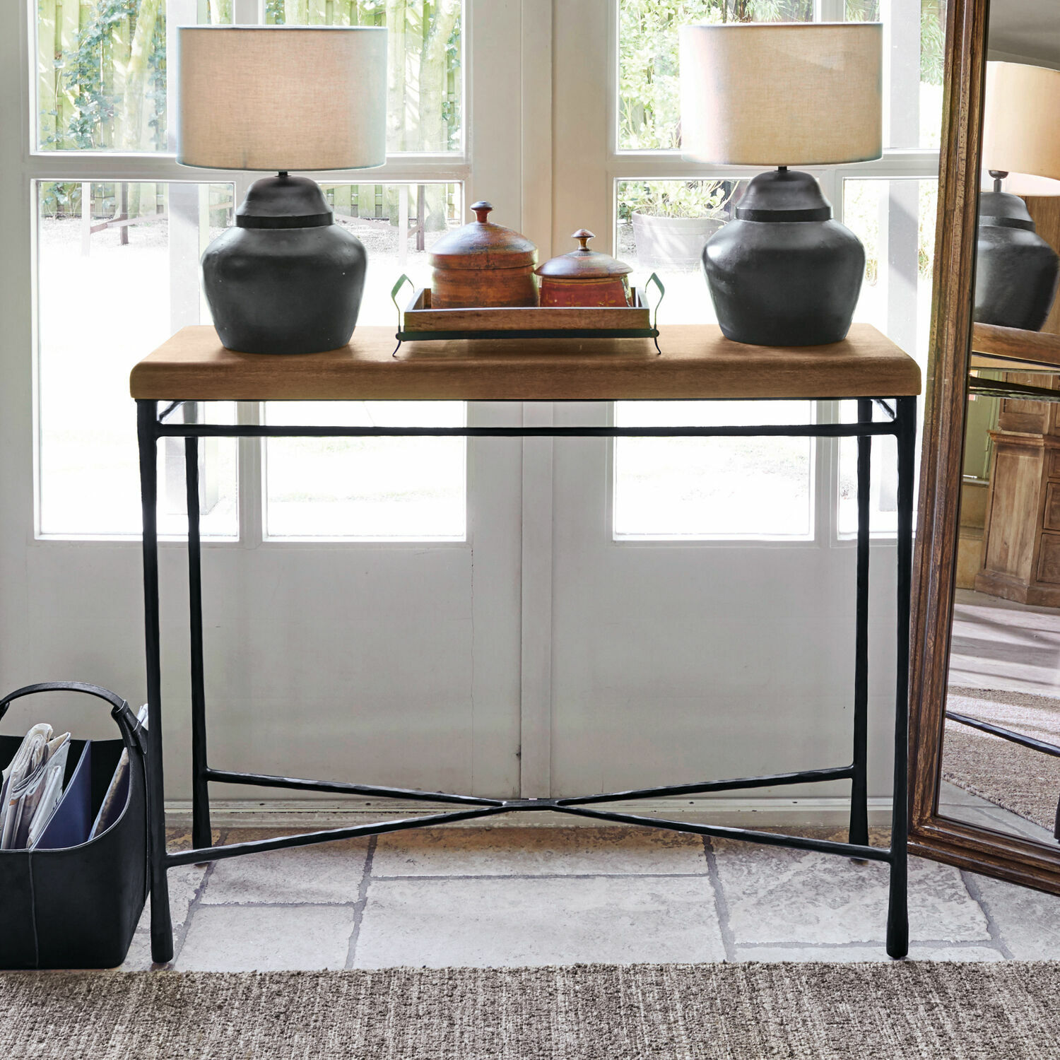 Ein Konsole mit dem gewissen Etwas! Der Materialmix fällt zuallererst in Auge. Das Gestell besteht aus Schmiedeeisen und besticht mit einer einzigartigen Strukturoberfläche. Wie von Hand geschmiedet zeigen sich wunderschöne Strukturen, die bei jedem Tisch einzigartig sind. Die Tischplatte steht dem Gestell dabei in nichts nach. Sie ist aus Mangoholz und erfreut das Auge mit einer natürlichen Maserung, die sehr gut zu sehen ist. Trotz der so verschiedenen Materialien von Gestell und Ablagefläche, harmonieren diese besonders gut. So entsteht aus diesem Materialmix ein wahres Kunstwerk, an dem man sich täglich erfreuen kann. Ob im Flur oder im Wohnzimmer, solch eine Konsole wird auch Ihren Besuchern positiv auffallen. Eine Vase mit frischen Blumen oben drauf gestellt oder vielleicht mit Bilderrahmen Ihrer Liebsten verziert – diese Konsole bietet Platz für allerlei Deko und Zierde. Der kunstvolle Eye-Catcher ist formschön, hochwertig, stabil, edel und zeitlos elegant zugleich – und damit vielleicht Ihr zukünftiges Lieblingsmöbelstück. Durch sein geradliniges, klares Design und den faszinierenden Material-Mix aus Eisen und Mangoholz harmoniert er mit dem klassischen Landhaus-Stil ebenso wie mit einem stylischen Industrial-Design. Der Couchtisch 20867 ergänzt die Konsole perfekt.