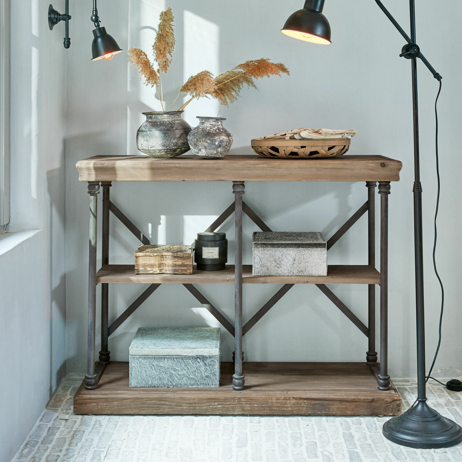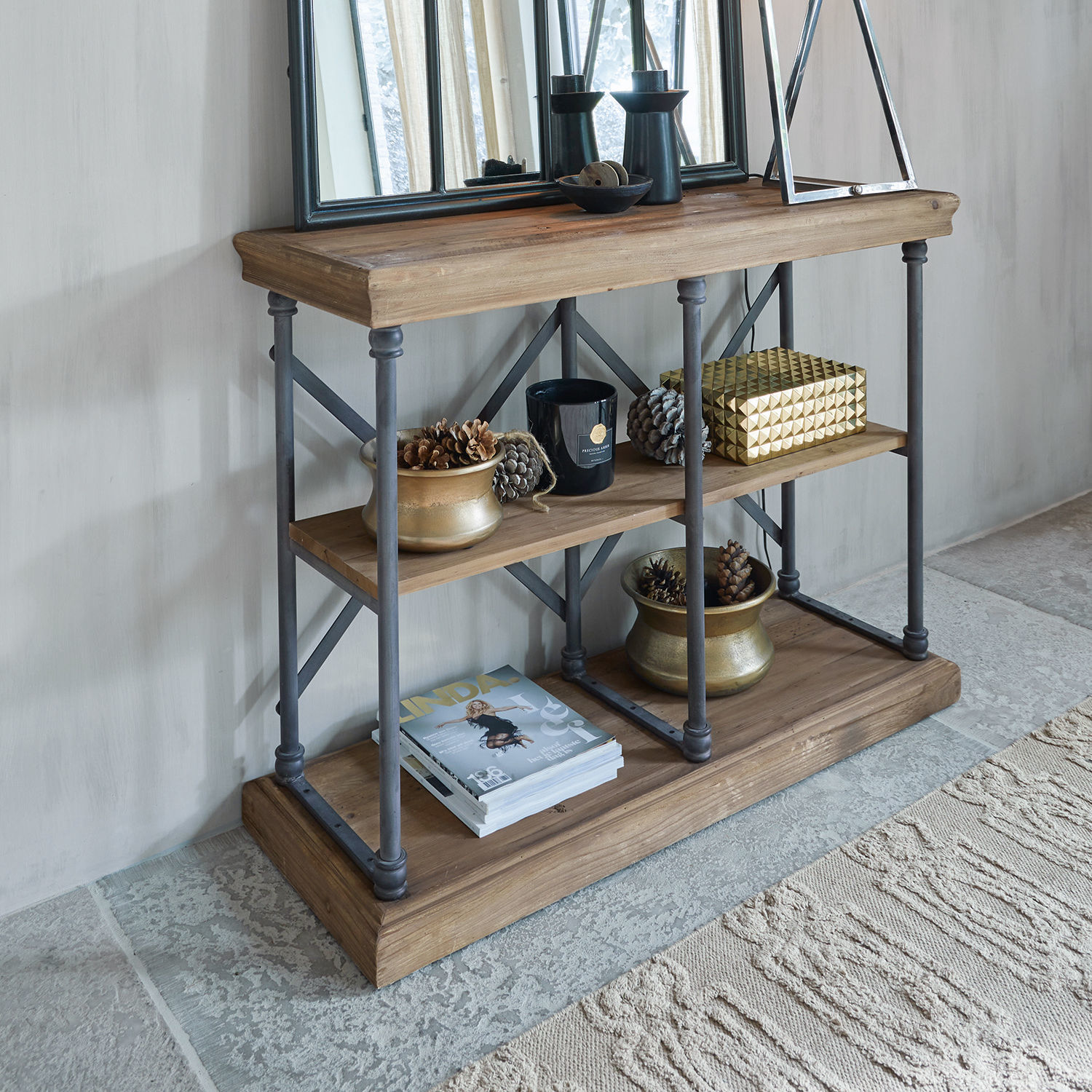 Rustikales Landhaus-Flair und Industrial-Anmutung in perfekter Balance. Diese Konsole ist ein kleines Meisterwerk moderner Möbelkunst, die ihre Anziehungskraft aus dem perfekten Zusammenspiel der Materialien Holz und Eisen gewinnt. Wobei die Materialkombi nicht grundsätzlich neu ist, sondern bei vielen traditionellen Landhaus-Möbeln im französischen Stil zu finden ist. Doch für diese Konsole hat der Designer ein spannendes Wechselspiel inszeniert, das die Materialien eine etwas andere Sprache sprechen lässt als bisher gewohnt. So ist das Gestell aus Eisen – wie im industriellen Bereich üblich – in erster Linie für die Tragfähigkeit der Konstruktion verantwortlich, darf sich hier aber mit Zierelementen schmücken, die an die handgedrechselten Beine antiker Tische und Kommoden erinnern. Im Gegenzug beschränken sich die massiven Holzbohlen auf nur wenige Landhaus-typische Details wie kleine Zierleisten an der unteren und der elegant geschwungenen Kranzverarbeitung der oberen Holzplatte. Das Hauptaugenmerk liegt auf der charakterstarken Maserung des Holzes, zu der jungem Holz meist noch die Ausstrahlung fehlt. Um dem schweren Eisen einen gewichtigen Kontrapunkt zu geben, hat der Designer deshalb für diese Konsole wiederaufbereitetes Tannenholz gewählt. Das sind Hölzer, die früher als Dachstuhl, als Heuschober oder auch als Fußboden dienten und die Erfahrungen ihres früheren Lebens mit in das neue Möbelstück einbringen. Das Ergebnis dieser raffinierten Material- und Stil-Kombi: Die Konsole fühlt sich im gemütlichen Landhaus-Ambiente ebenso zu Hause wie in Gesellschaft von Möbeln im Industrial-Style.