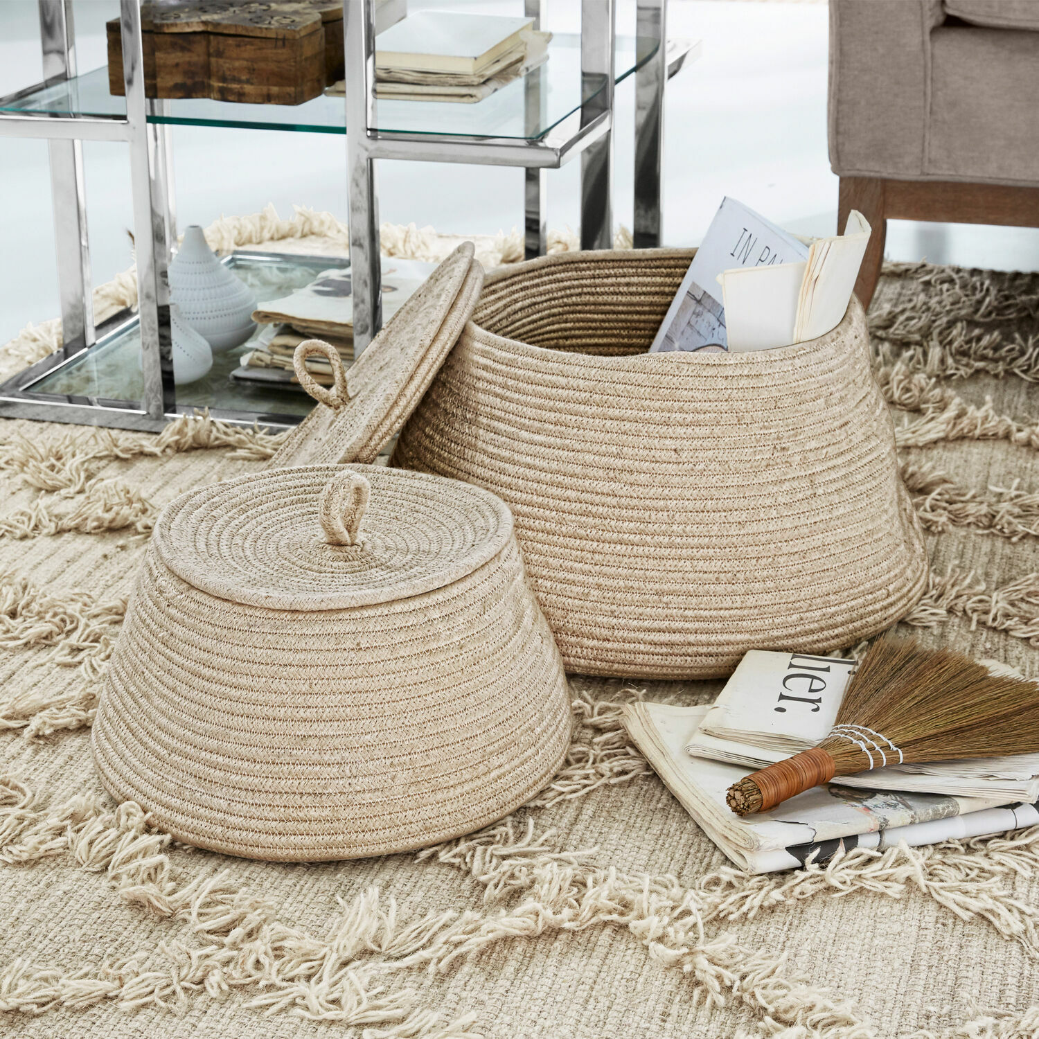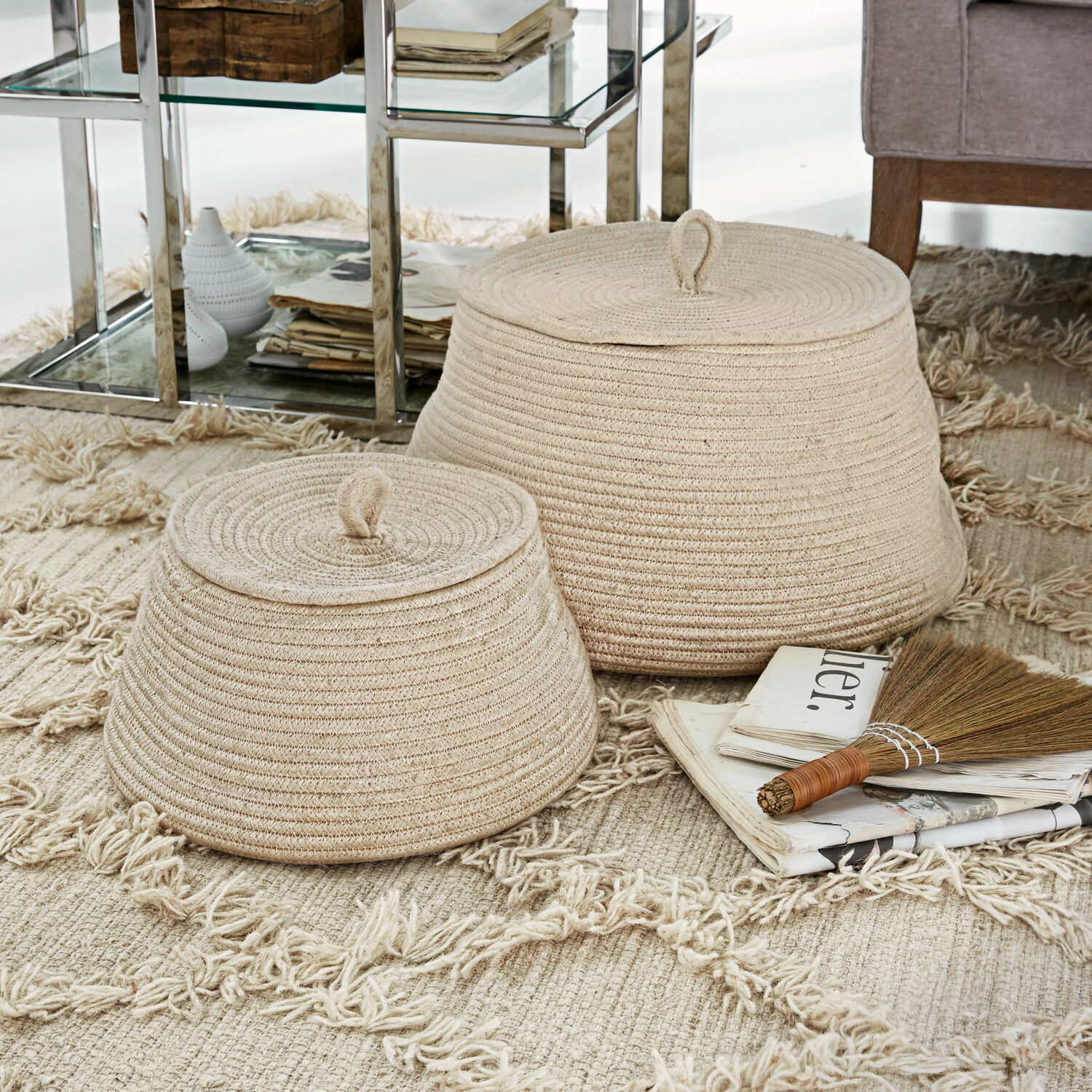 Wunderbar praktisch und schön anzusehen: Dieses unkonventionelle Korbduo zieht die Blicke an. Seine freundlich-runde Form, das weiche Baumwollmaterial, die schmucken Deckel mit den kleinen, verspielten Henkelschlaufen sorgen für bezaubernde dekorative Akzente. Dazu fühlen sich die praktischen Helfer auch noch großartig an. Die beiden Körbe sind unterschiedlich groß, sodass der kleinere in den größeren passt, zum Beispiel wenn Sie Platz sparen möchten. Zweifellos bereichern sie jedes Wohnambiente. Dabei harmonieren sie besonders gut mit dem Landhausstil und einer Umgebung mit Holz, das den natürlichen Charme des Duos noch unterstreicht. Ob Handarbeitsutensilien, Bastelmaterial oder Spiele – alles ist in den schicken Körben gut aufgehoben und Ihre Wohnung wirkt wunderbar aufgeräumt.