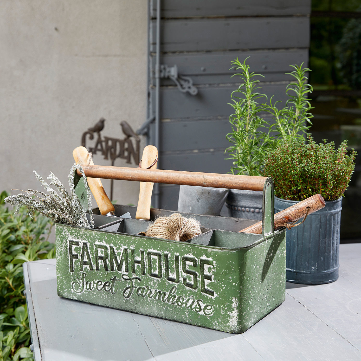 Sie wünschen sich idyllisches Farmhaus-Flair, selbst wenn Sie vielleicht in der Stadt leben? Dann ist dieser charmante und rustikale Korb die perfekte Wahl. Er ist mit einem dazu passenden Print geschmückt und besteht aus Eisen mit Antik-Finish sowie edlem Tannenholz. Durch das Finish hat er eine hübsche Patina. Dank des dekorativen Henkels lässt er sich ganz leicht umher tragen, was zum Beispiel bei der Gartenarbeit hilfreich ist. Innen hat er vier kleine und ein größeres Fach. Putz-Utensilien, Accessoires für den Garten, Bastelbedarf oder kleine Dinge, die sortiert und aufbewahrt werden sollen, finden darin ein Plätzchen. Und wer mag, kann den schicken Korb auch bepflanzen und sich so pures Country-Feeling auf den Balkon oder in Innenräume holen.
