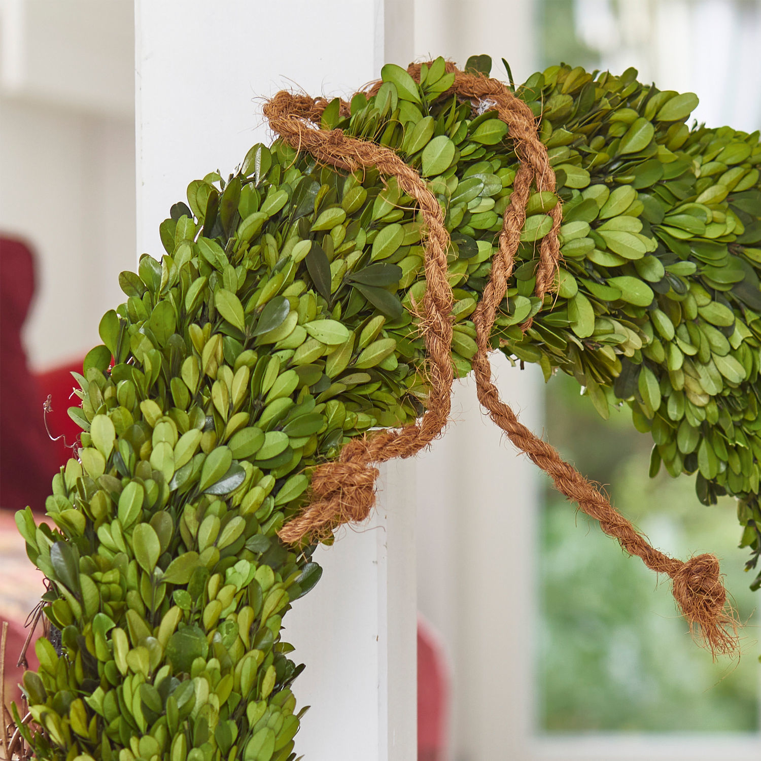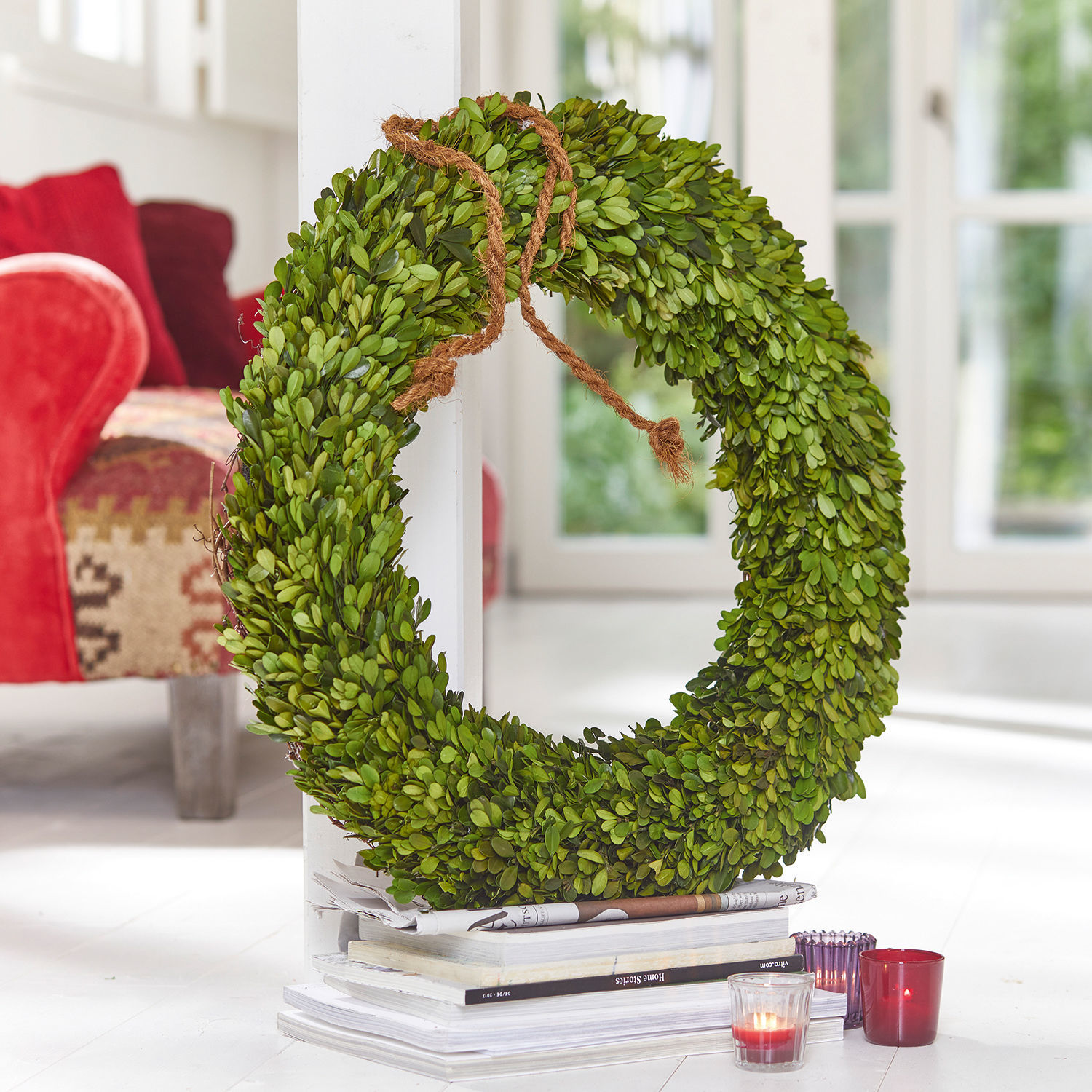 Ein Schmuckstück aus der Natur, das liebevoll von Hand verlesen und gebunden ist. Der schöne Kranz besteht aus echtem, getrocknetem Buchsbaum. Eine zeitlose und elegante Optik, an der sie sich das ganze Jahr über erfreuen können. Als Türkranz, Wandschmuck oder auf den Tisch oder eine Anrichte gelegt macht er eine sehr gute Figur. Das hübsche Modell lässt sich ganz leicht an der Wand oder einem Holzpfosten aufhängen. Sie könnten ihn auch mit einem dekorativen Band schmücken und daran aufhängen. Freuen Sie sich zur Winterzeit wie auch im Sommer über diesen harmonischen Anblick und genießen Sie jederzeit die Schönheit der Natur. Ein Highlight zu jedem Ambiente, welches sich kreativ und individuell mit Accessoires wie etwa Windlichtern kombinieren lässt.