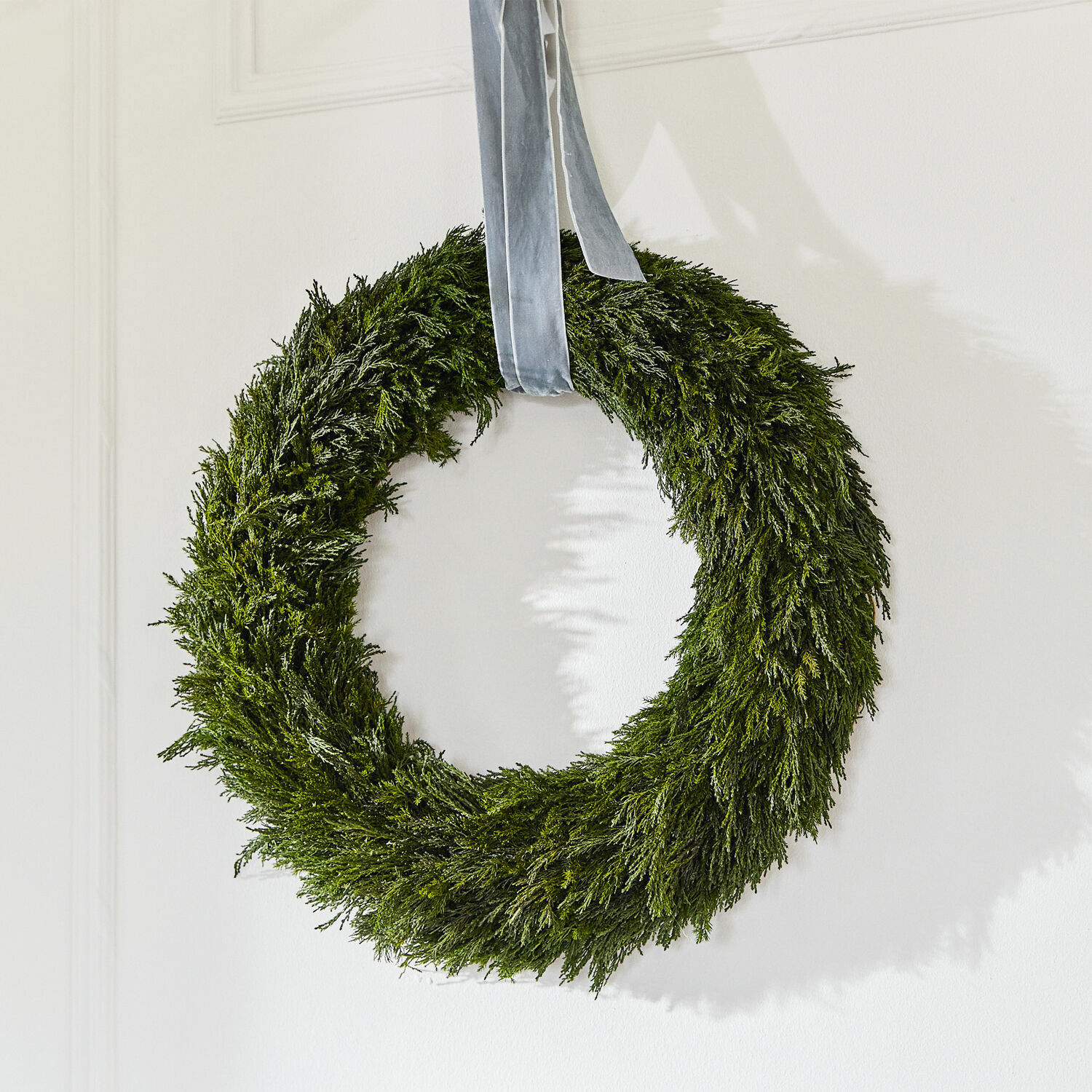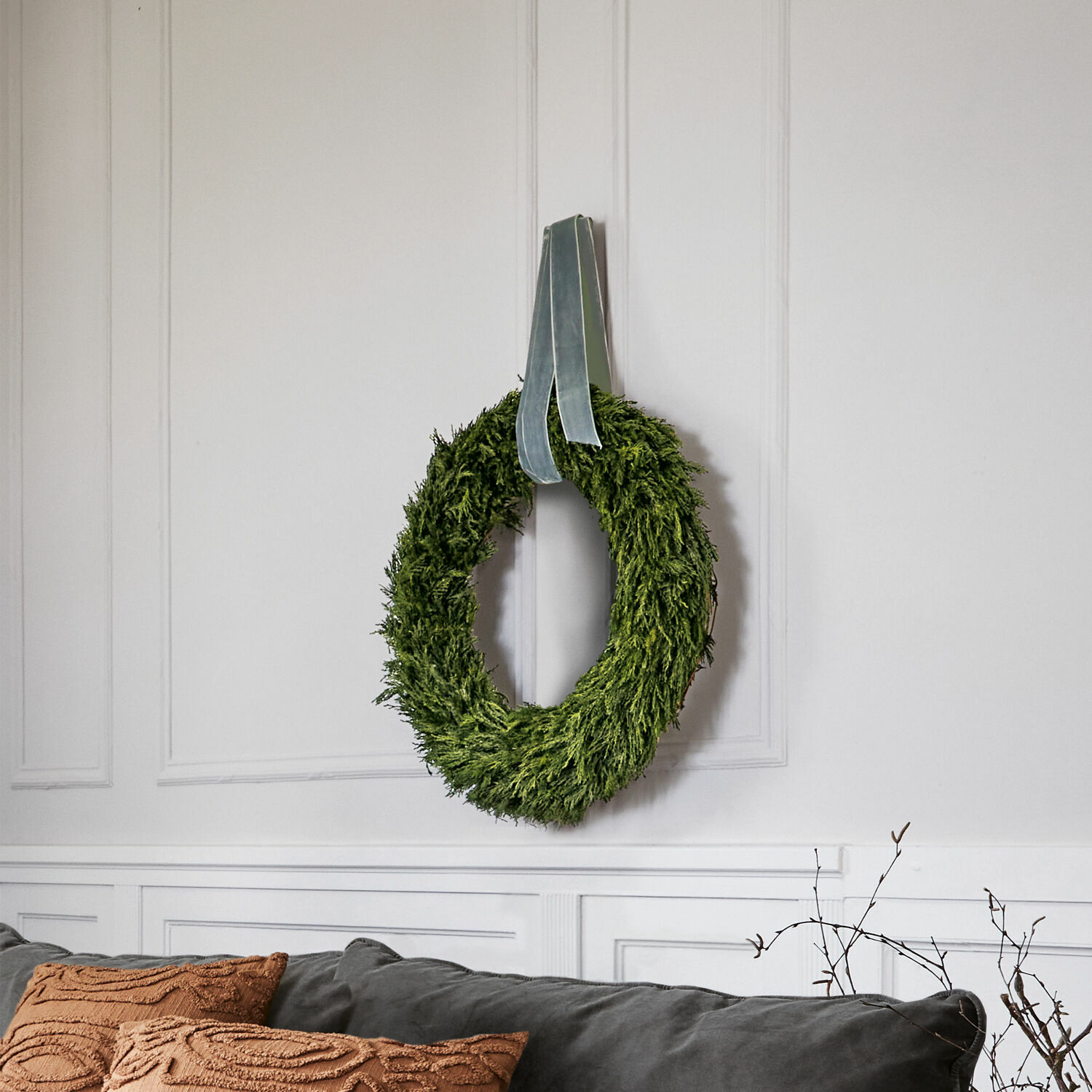 Erleben Sie ein luxuriöses und rein natürliches Schmuckstück, an dem Sie lange Freude haben. Der große Kranz besteht aus echter, konservierter Zypresse. So bringen Sie natürliches Grün in Ihre Vier-Wände ohne, dass Sie es pflegen müssen. Unter der Zypresse befindet sich ein Gestell aus Rattan, das aus vielen kleinen Hölzern zusammengebunden wurde. Sie können den Kranz legen oder aufhängen, wobei Sie ihn mit einem hübschen Band oder einer Schleife verzieren könnten. Auch eine saisonale Dekoration mit Weihnachtsschmuck oder Ostereiern bietet sich an. Diese Naturschönheit macht zu jedem Ambiente eine gute Figur, und wer mag, kann den hübschen Kranz auch als Natur-Element das ganze Jahr über hängen lassen. Er sollte nur innen verwendet werden – vielleicht an der Tür, einem Dachbalken, der Wand oder im Fenster aufgehängt. Werden Sie kreativ und holen Sie sich ein naturnahes, wertvolles Accessoire nach Hause.