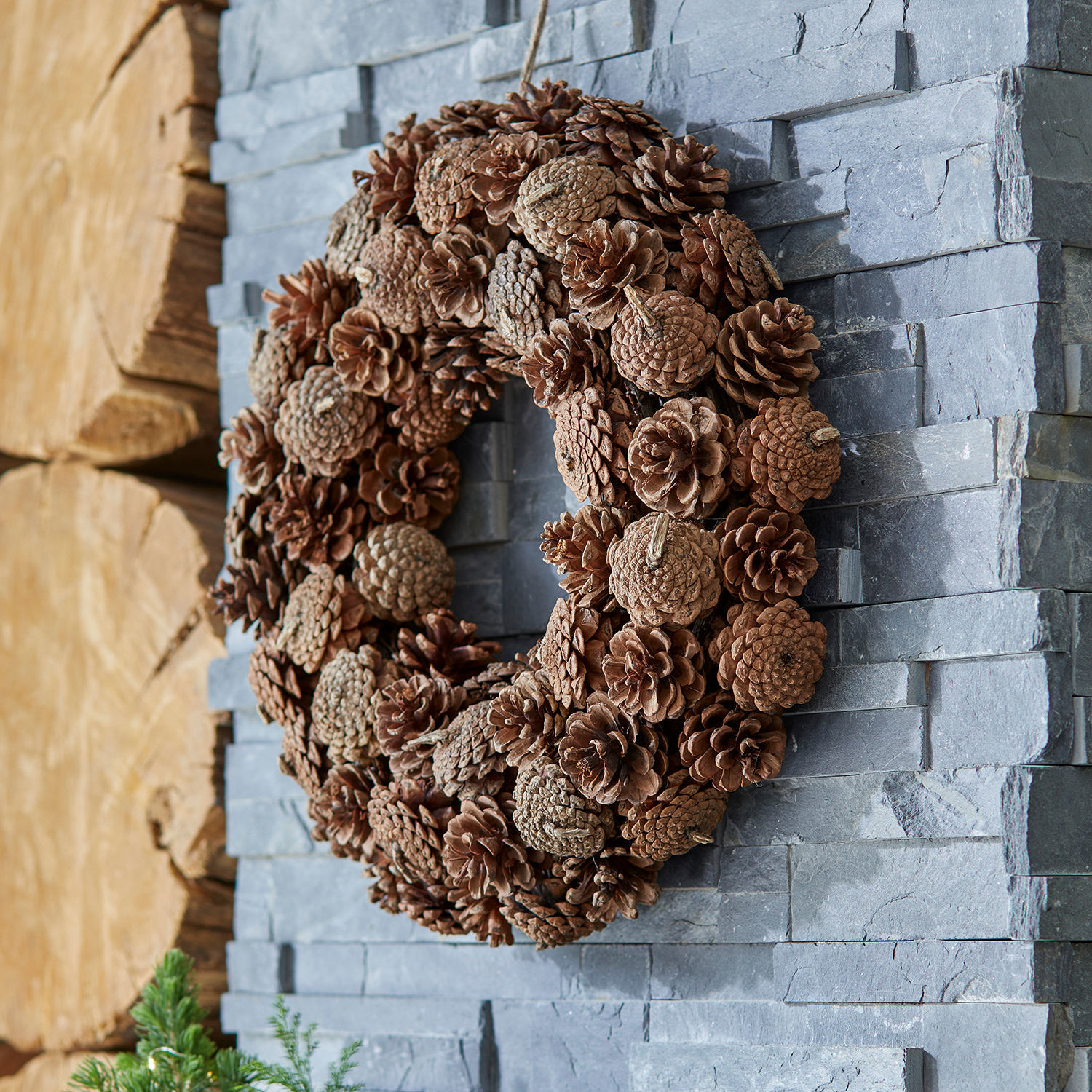 Dieser kunstreich gearbeitete Kranz verleiht jedem Ambiente einen Hauch von rustikaler Romantik. Ein wunderbarer Schmuck für die Festtage, doch eigentlich ist er viel zu schön, um nur wenige Wochen im Jahr präsentiert zu werden. Deshalb lassen Sie ihn doch einfach hängen und erfreuen Sie sich an charmanten Details wie echten Kiefernzapfen, hübschen Zweigen und der charmanten Jute-Kordel. Der Kranz kann an die Tür gehängt oder auf die Kommode gelegt und mit anderen Accessoires kombiniert werden.
