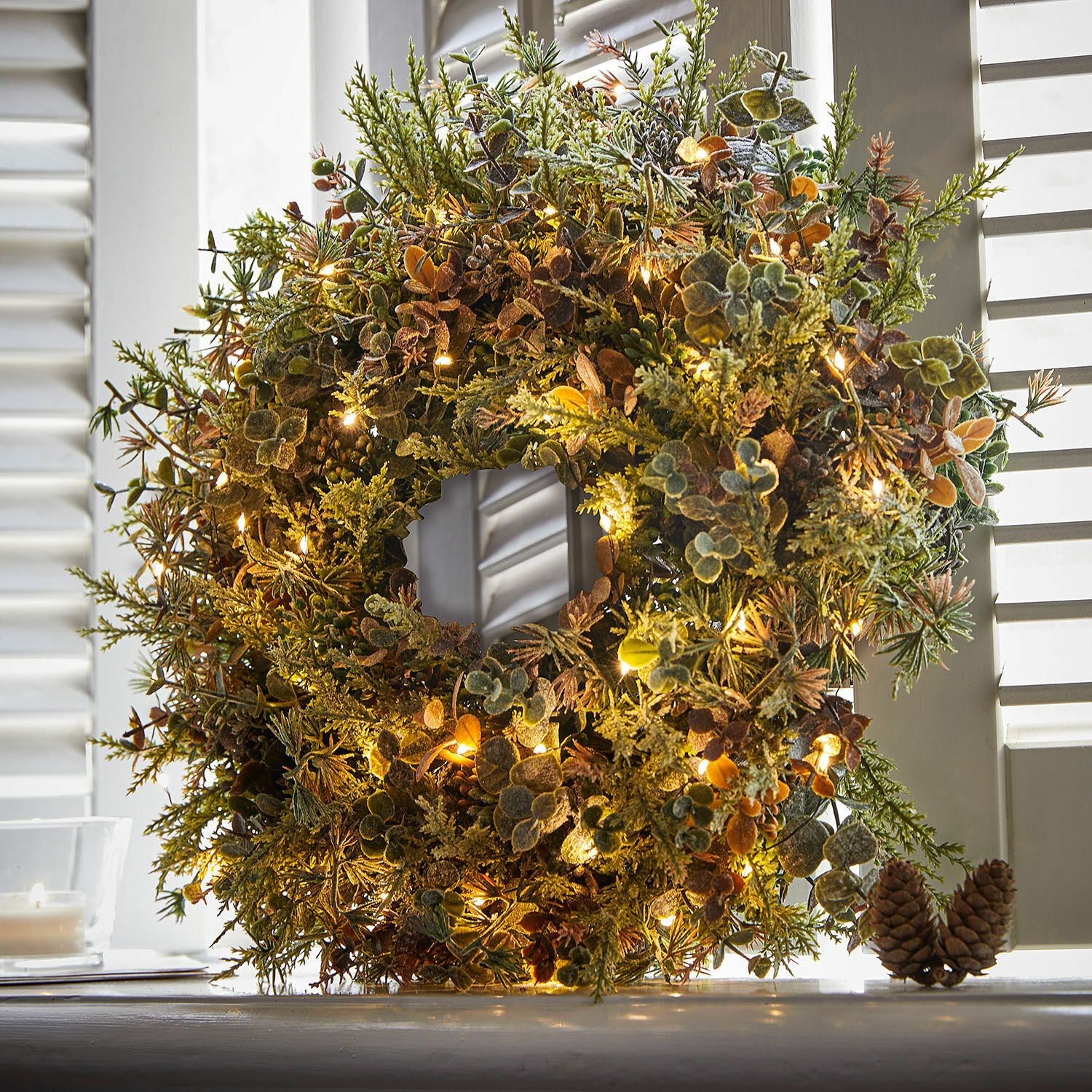 Der immergrüne Kranz mit naturgetreuen Nachbildungen von Eukalyptuszweigen und Heidekraut sorgt mit seinen LED-Leuchten für festliche Stimmung in Ihrem Zuhause. Er ziert Ihren Eingangsbereich und empfängt Ihre Gäste mit weihnachtlichem Ambiente, oder er versprüht auf Tischen oder Kommoden seinen bezaubernden Charme. Verwandeln Sie Ihre Wohnung mit diesem feinen Dekoobjekt zu einem festlichen Refugium der Ruhe und Muße. Ideal macht sich der Kranz natürlich als optisches Highlight auf Ihrer Festtagstafel. So kann Weihnachten kommen – und natürlich auch Ihre Liebsten, die es sicher zu schätzen wissen, wie stilvoll Sie alles zur schönsten Zeit des Jahres eingerichtet und dekoriert haben. Dieser Kranz gehört auf jeden Fall dazu!