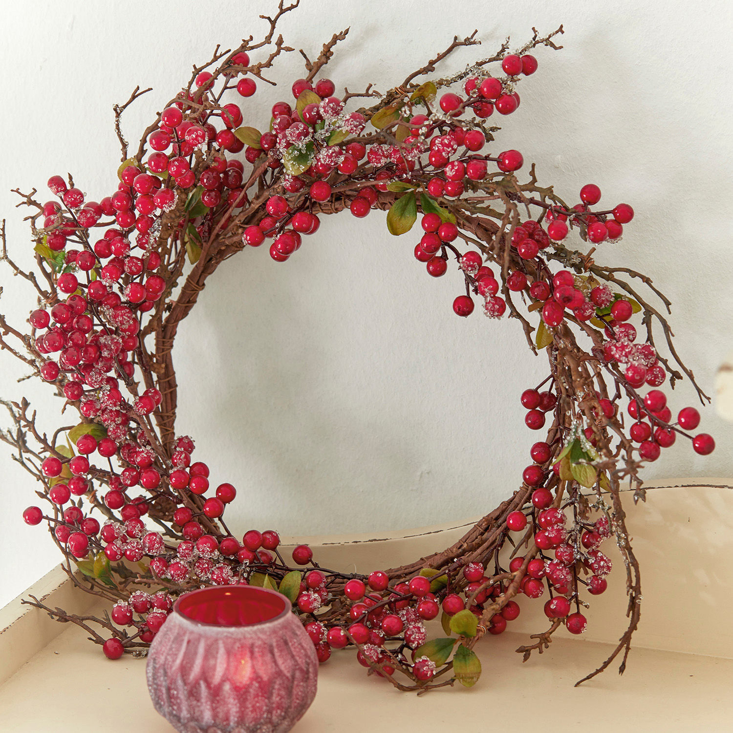Der schöne Vogelbeeren-Kranz ist sehr naturgetreu nachgebildet und sieht ganz echt aus. Viele Beeren sind detailverliebt arrangiert, sodass er wie frisch gebunden erscheint. Der recht große Kranz bleibt für immer frisch, sodass Sie sich viele Jahre daran erfreuen können. Vor allem im Herbst und Winter ist er ein stimmungsvolles Accessoire, vielleicht ja an einem dekorativen Band an der Tür aufgehängt. So wirkt Ihr Heim gleich einladend. Oder schmücken Sie die Wand, eine Konsole oder den Tisch mit diesem hübschen Stück. Es ist zu jedem Interieur ein Gewinn, und besonders zum gemütlichen Landhaus-Stil mit hellem Holz versprüht das hübsche Stück seinen Charme. Mit diesem farbenfrohen Kranz entsteht ein stimmiges Bild, das Ihr Zuhause noch gemütlicher macht.