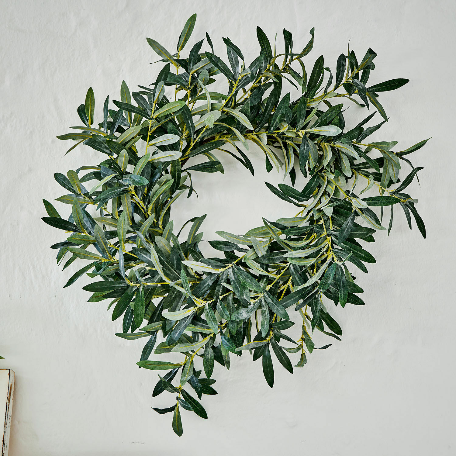 Die Schlichtheit dieses Olivenkranzes macht ihn für jede Jahreszeit perfekt. Er wirkt täuschend echt, denn seine natürlich schönen Blätter und Zweige wurden mit großer Liebe zum Detail gestaltet. Er kann direkt aufgehängt werden oder Sie legen Ihn auf einen Tisch oder eine Anrichte. Die Vorteile des künstlichen Kranzes liegen auf der Hand: Er verliert keine Blätter, verursacht keinen Schmutz und behält seine Schönheit für immer. Hängen Sie den Kranz an die Eingangstür, um Gäste mit Herzlichkeit zu empfangen oder platzieren Sie ihn auf der Wohnzimmerkommode, um ihn mit anderen Deko-Objekten zu kombinieren. Fast zu jeder Saison ergeben sich tolle Einsatzmöglichkeiten. Werden Sie kreativ mit diesem immergrünen Olivenkranz!