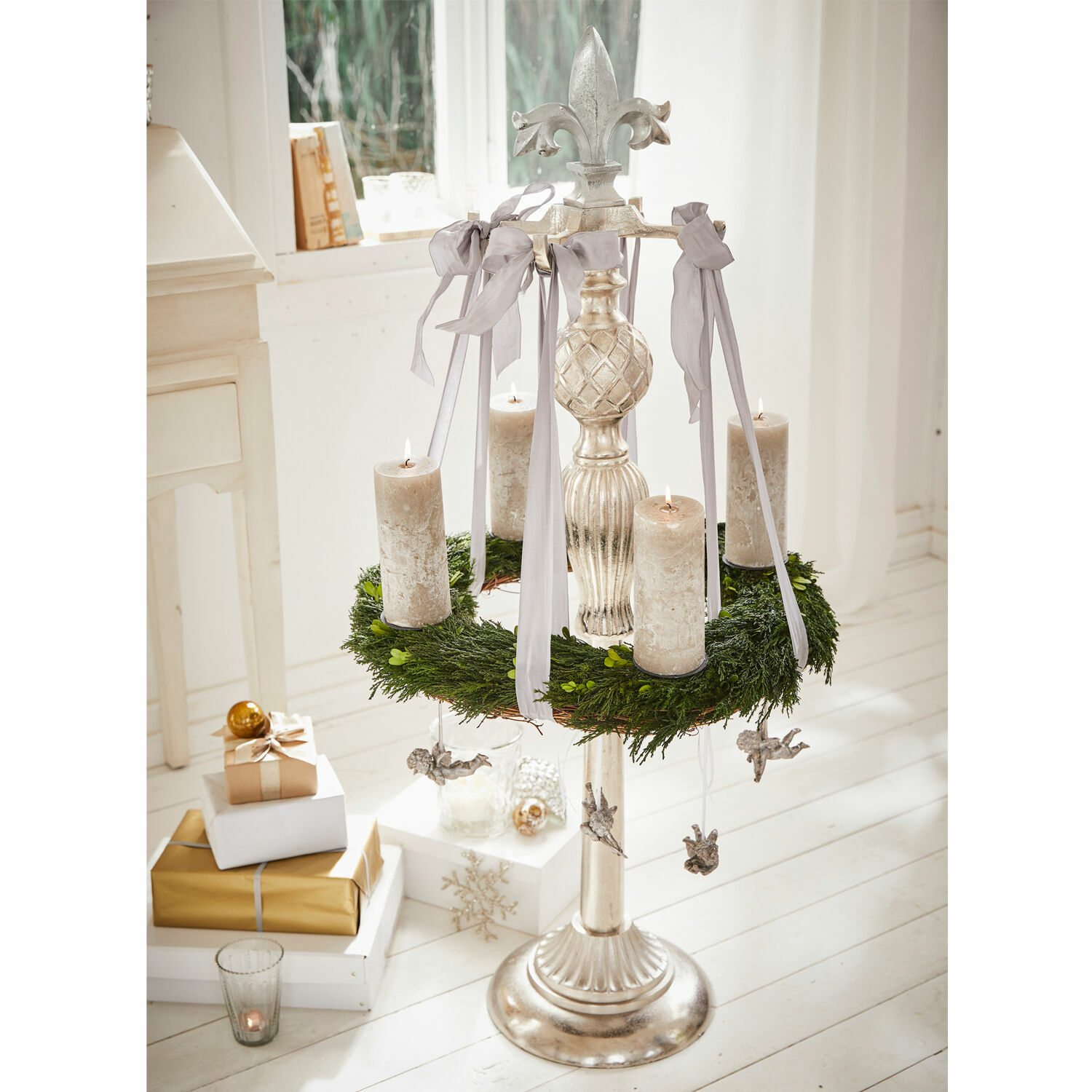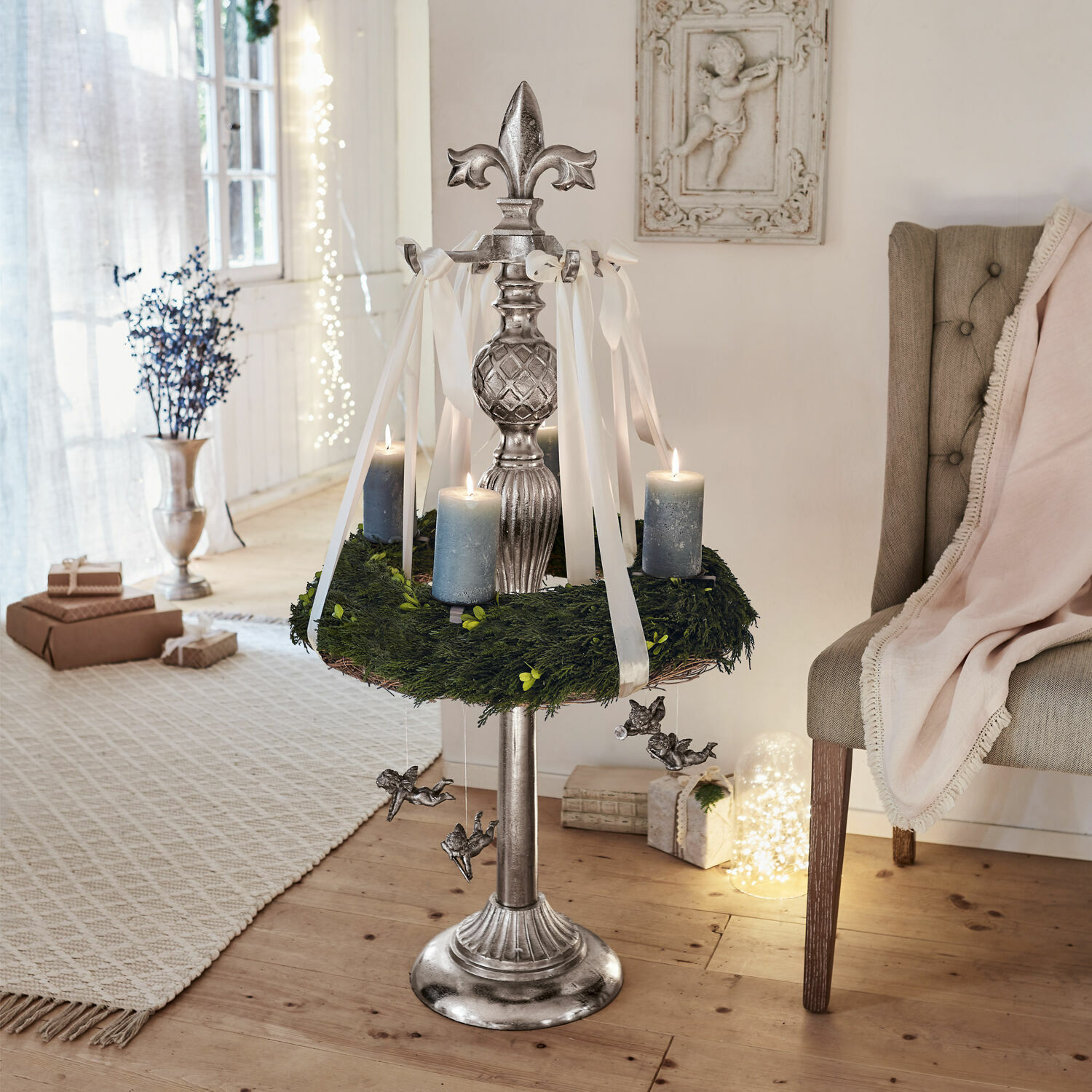 Eine stilvolle Liaison aus Massivität und Eleganz: Dieser Kranzständer bringt soliden Aluminiumguss mit ornamentaler Zierde zusammen. Die seitlichen Halterungen nehmen dankbar Ihre schönsten Weihnachtskränze auf – oder auch andere Deko-Schmuckstücke, die sich aufhängen lassen. Platzieren Sie dieses Kunstwerk am besten an einer Position mit viel Raum, sodass es seine beeindruckende Wirkung voll entfalten kann. Ob im Wohnzimmer, im festlich geschmückten Wintergarten oder im Eingangsbereich Ihres Hauses – garantiert wird der Kranzständer alle Blicke auf sich ziehen. So setzen Sie dekorative Akzente von höchstem Stil. Praktisch: Der Fuß ist mit Filz versehen, sodass Ihr schöner Boden unversehrt bleibt. Ein Schmuckstück, das alles andere als alltäglich ist! Sie erhalten den Kranzständer ganz ohne Deko, sodass Sie selbst kreativ werden können. Befestigen Sie ganz individuell saisonale Kränze daran und erfreuen Sie sich daran das ganze Jahr hindurch.