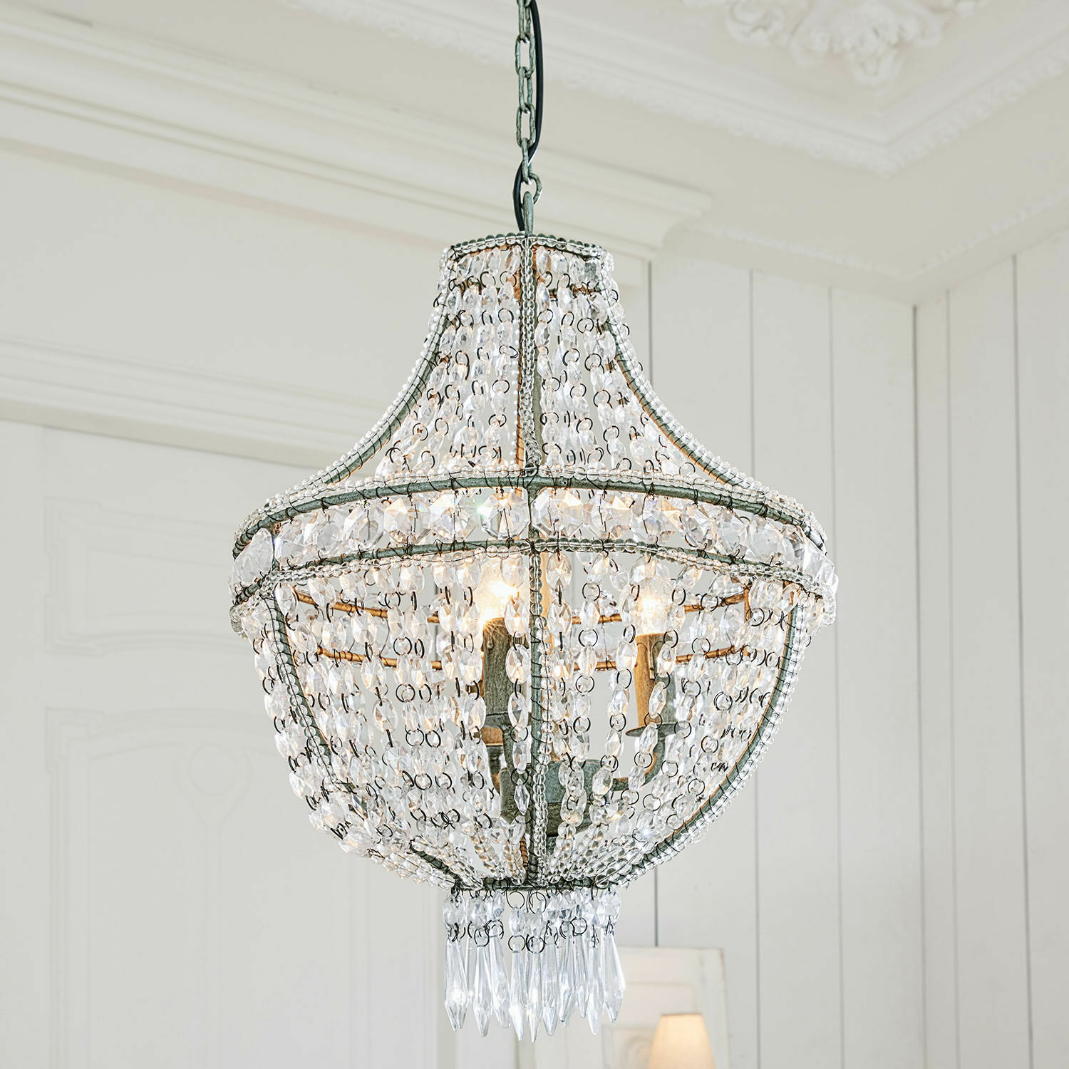 Waren opulent gearbeitete Kronleuchter jahrhundertelang fester Bestandteil prunkvoller Säle und mondäner Salons, wo ihre Glasprismen von Hunderten von Kerzen zum Funkeln gebracht wurden und die Räume stimmungsvoll erhellten, wurde es im 20. Jahrhundert still um die luxuriösen Raum-Objekte. Jetzt aber feiern sie ein glanzvolles Comeback, denn plötzlich ist ein bisschen Glamour wieder gefragt. Und jetzt haben sie auch die rein gesellschaftliche Ebene verlassen. Sprich Kronleuchter bereichern mit ihren Lichtspielen nicht nur repräsentative Wohn- und Esszimmer sowie Eingangshallen, sondern erobern sich auch die privateren Bereiche eines Hauses. Gerade in klassisch eingerichteten Schlafzimmern sorgt ein Kristalllüster für eine ganz besondere Atmosphäre, wenn sich das Licht hundertfach in den unzähligen, kunstvoll geschliffenen Glasprismen bricht und für aufregende Lichteffekte im Raum sorgt. Dieser Kronleuchter ist im antiken französischen Stil aufwendig von Hand gefertigt, das Gestell besteht aus Eisen, das mit einem silberfarbenen Antik-Finish veredelt wurde. In Erinnerung an die Zeit, als Kronleuchter von echten Kerzen erleuchtet wurden, sind die drei Fassungen im Inneren so angebracht, dass die Leuchtmittel aufrecht stehen. Tipp: Wählen Sie Leuchtmittel in Kerzenform, um die Illusion perfekt zu machen.