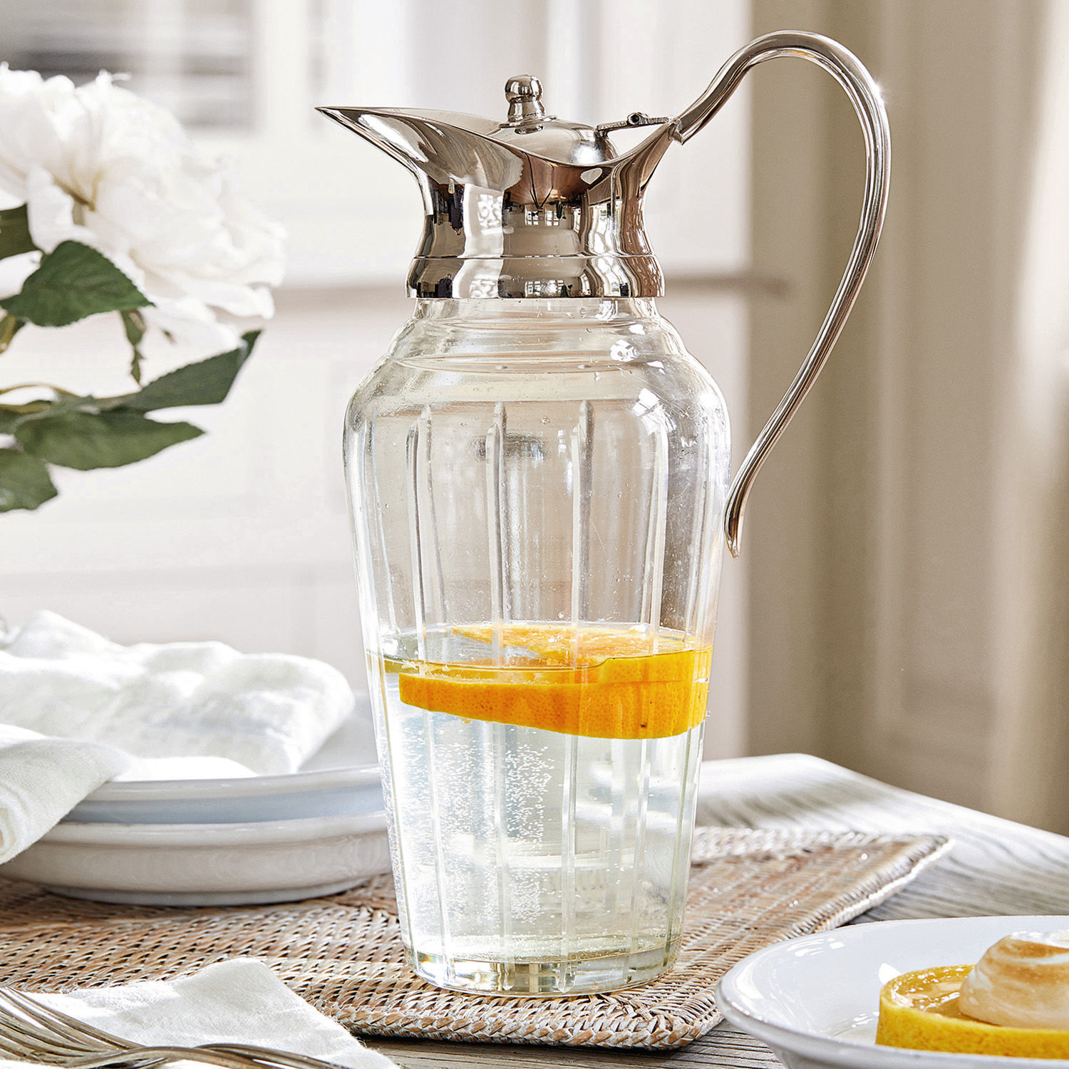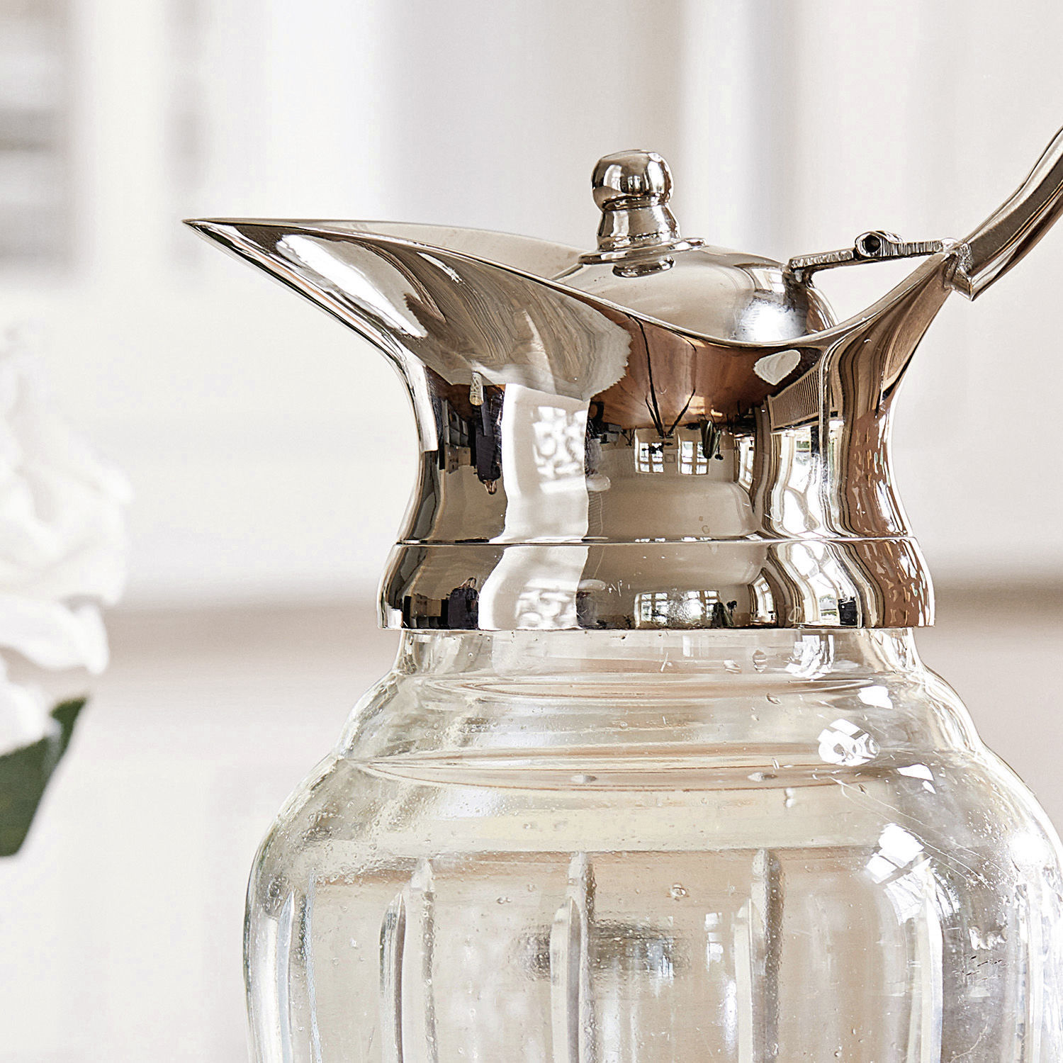 Wer Wert auf stilvolle Tischkultur legt, wird nicht nur von edlem Porzellan speisen und aus wertvollen Kristallgläsern trinken, sondern auch das obligatorische Tafelwasser in einem schönen Krug servieren. Dieser hier ist ein besonders erlesenes Teil, das jede Tafel zieren wird. Neben der eleganten Linienführung, die von einem klassischen Rillenschliff dezent betont wird, zeichnet sich der Krug durch eine besondere Reinheit des Glases aus – ein Qualitätsmerkmal, das gerade bei mundgeblasenem Glas eine Besonderheit ist und von den Kennern unter Ihren Gästen sicherlich sofort bemerkt wird. Der geschwungene Griff, der auch bei einem gut gefüllten Krug perfekt in der Hand liegt, sowie der großzügige Ausgießer sind aus glänzendem Messing und runden die Kreation stilvoll ab. Ein formschönes und zugleich praktisches Detail ist der kleine Deckel, der verhindert, dass Schmutz oder Insekten in den Krug gelangen, wenn der Krug im Sommer auf der Terrasse zum Einsatz kommt. Unser Tipp: Aromatisieren Sie das Tafelwasser doch einmal mit verschiedenen Zutaten. Zitronenscheiben und Minze sind der erfrischende Klassiker für heiße Sommertage. Mango, Limette und Zitronengras verwöhnen den Gaumen Ihrer Gäste mit exotischen Aromen. Aber natürlich können Sie auch frisch gepresste Säfte und andere Erfrischungsgetränke in der Glaskaraffe servieren. Und wird der Krug nicht gebraucht, beweist er als dekorativer Hingucker auf der Anrichte im Esszimmer oder neben der Bar das Niveau Ihres Hauses.