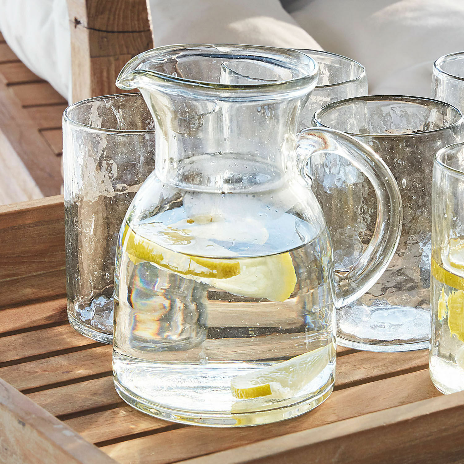 Ein absoluter Klassiker, an dem Sie sich jahrelang erfreuen können – dieser formschöne Krug aus dickem, mundgeblasenen Glas ist immer eine Zierde. Er lässt sich für Getränke oder auch als Vase nutzen und ist ein echtes Multitalent. Servieren Sie darin Wasser mit Zitronenscheiben oder Säfte und Tee und trinken Sie so immer genügend – mit solch ansprechenden Accessoires fällt das noch leichter. Der edle Krug ist eine harmonische Zierde auf jedem gedeckten Tisch und kann vom Frühstück bis zum Dinner zum Einsatz kommen. Auch für die Lesestunde an warmen Tagen im Garten ist er ein guter Begleiter. Und wer mag, kann den feinen Krug auch als Vase verwenden, um Arrangements mit ländlichem Charme zu erschaffen, vielleicht mit frisch gepflückten Wiesenblüten, Gräsern oder auch Rosen aus dem Garten.