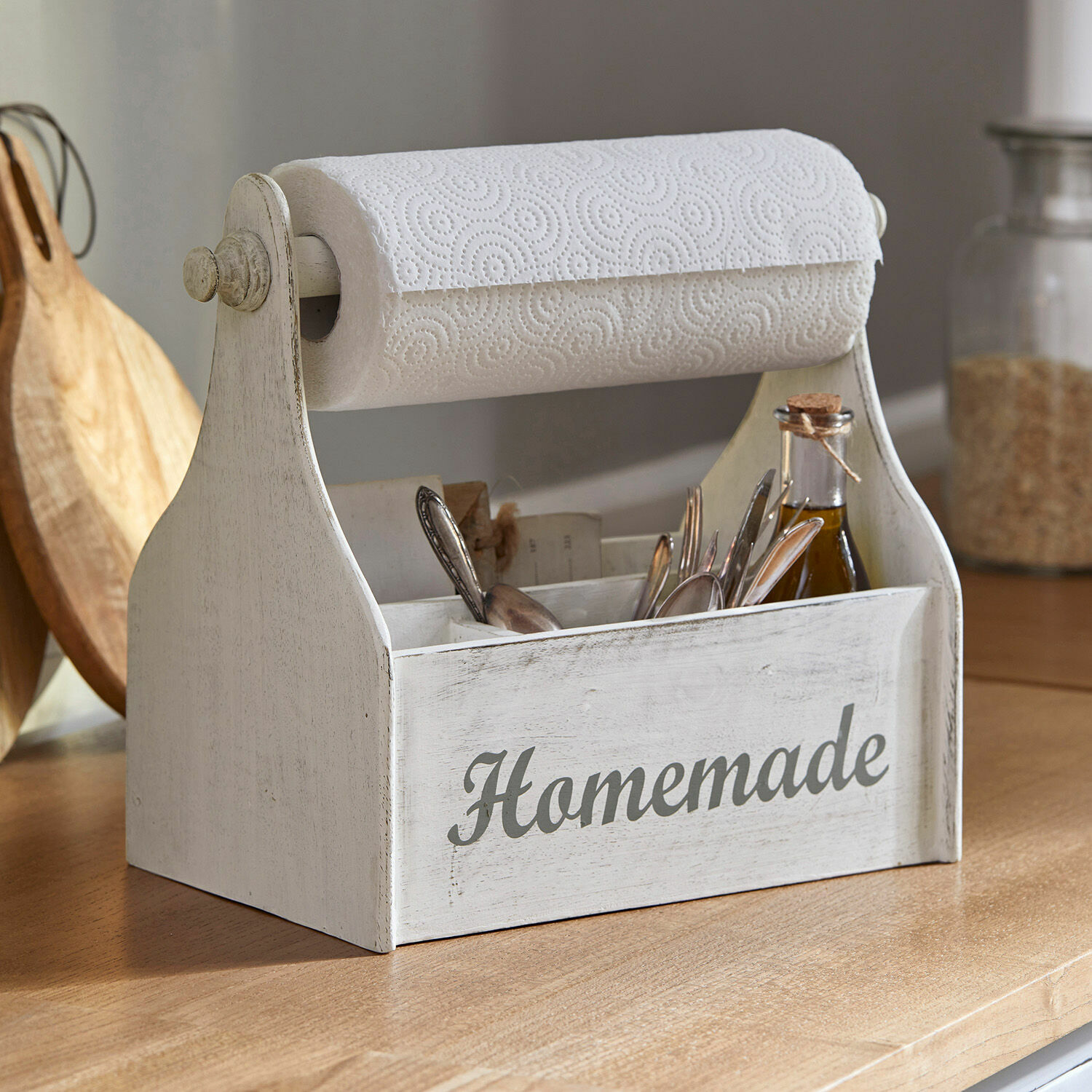 Manches sieht im Look vergangener Zeiten einfach schöner aus. Das beweist auch dieser nützliche Küchenabroller, der durch seine Machart an französische Entwürfe erinnert und viel Nostalgie-Charme ausstrahlt. Ein Kasten aus massivem Mangoholz dient als standhaftes Gestell, das durch das White-Washed-Finish und den dekorativen Vintage-Aufdruck seinen reizvollen Shabby-Chic erhält. Zwei formschön gearbeitete Seitenteile halten die darüber schwebende Stange, dabei müssen für das Einsetzen der Papierrolle die zwei seitlichen Fixier-Schrauben gelöst werden. Doch das Küchenaccessoire kann noch mehr. Denn der Innenraum ist in ein großes Fach und drei kleine Fächer aufgeteilt und bietet so ausreichend Platz für diverse Küchenutensilien oder vielleicht Ihre Essig- und Ölflaschen. Ein funktionstüchtiges Accessoire, das in Ihrer Landhaus-Küche ein echter Blickfang ist.