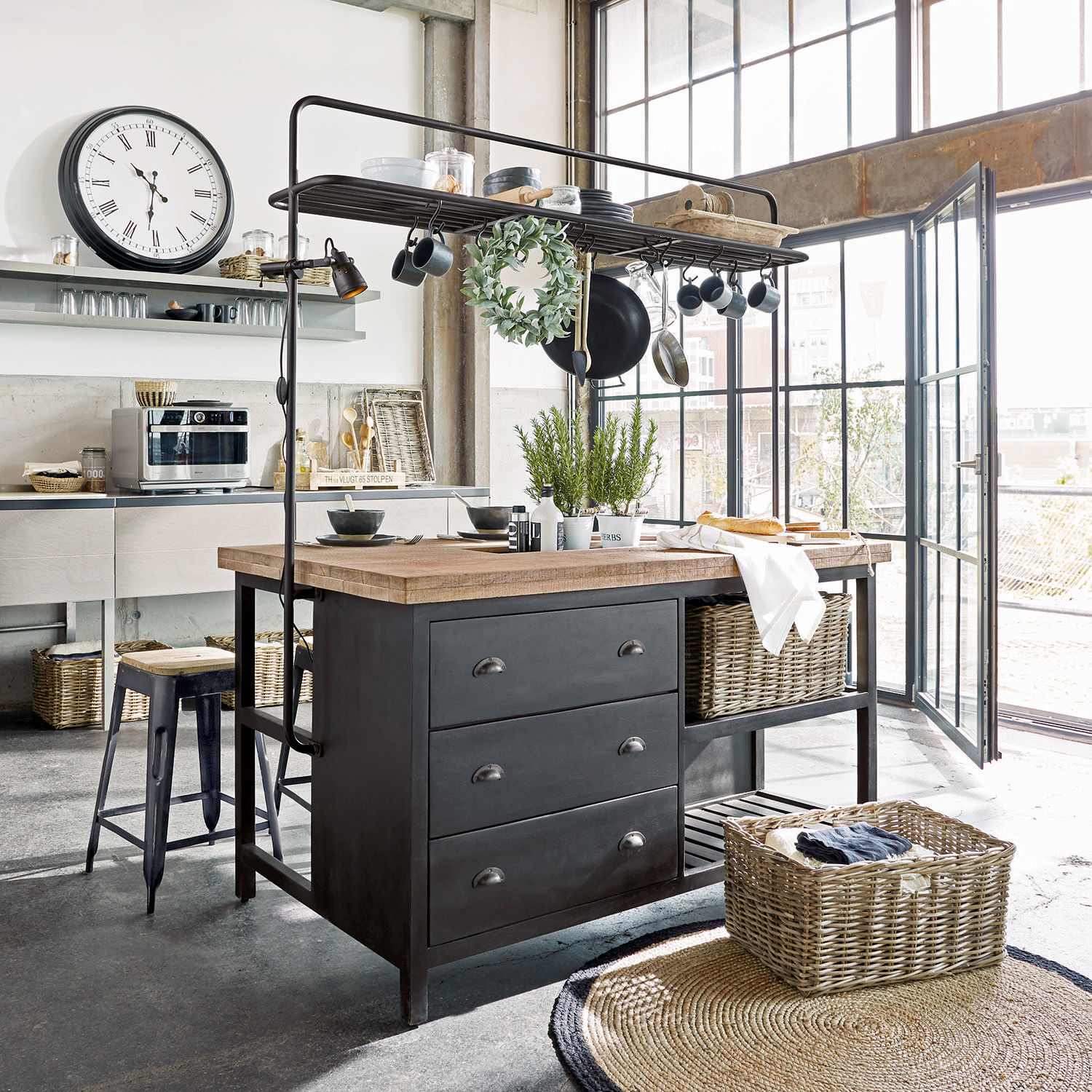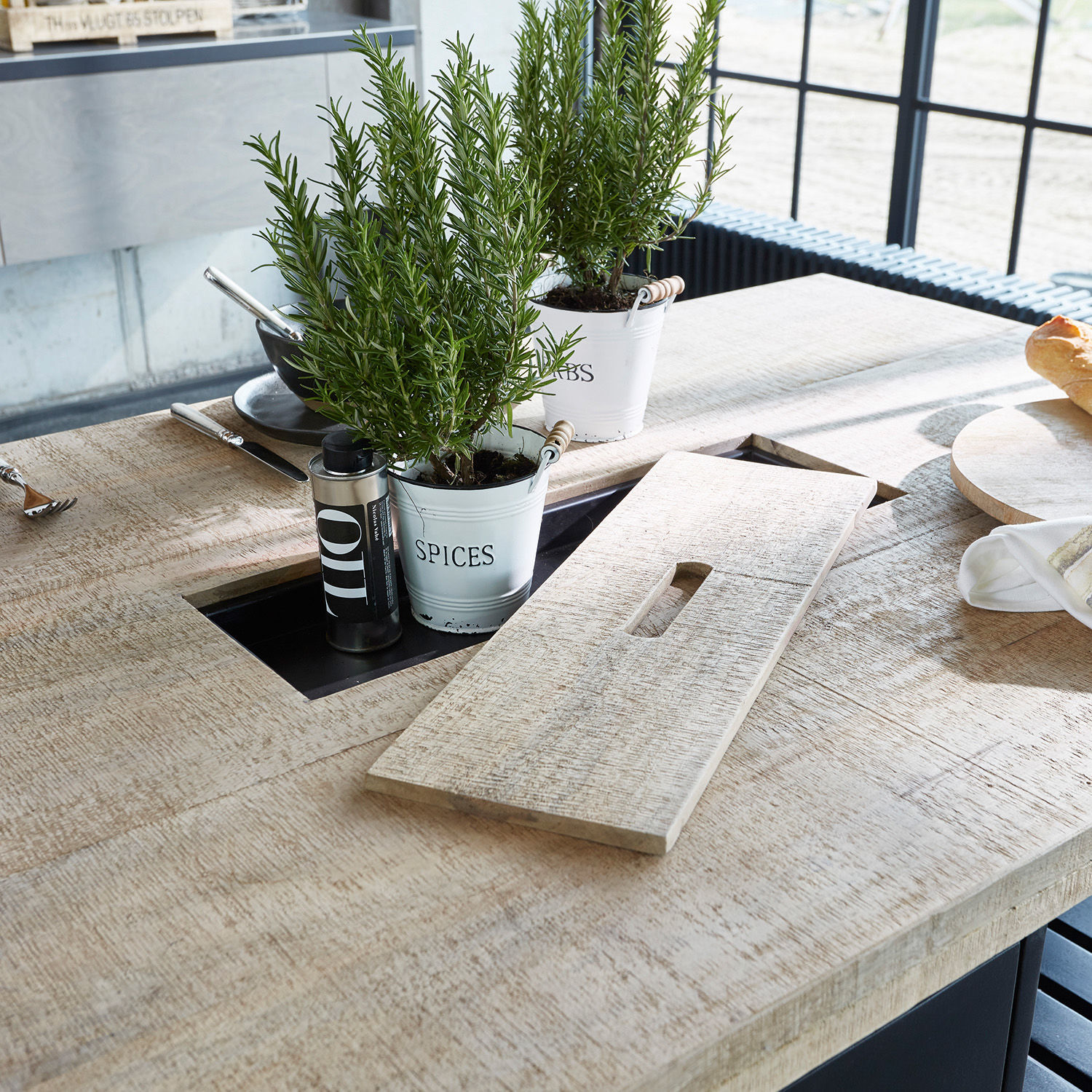 Immer mehr Menschen entdecken die Freude am Kochen. Deshalb wurde dieser Küchenblock als von allen Seiten zugängliche Insel konzipiert, so dass beim nächsten ‘Kochduell′ auch Ihre Freunde mitarbeiten können. Neben der großzügigen Arbeitsfläche bietet der Küchenblock darüber hinaus viel Stauraum in den drei Schubladen wie in den offenen Fächern. Ob gerade der Korkenzieher, das Fleischthermometer oder der Gemüsehobel gebraucht wird – das passende Werkzeug ist schnell zur Hand. Nach welchem Rezept heute gekocht wird? Das steht in einem der Kochbücher, die in den offenen Regalfächern untergebracht sind. Oder warten dort Ihre große Salatschüssel oder Großmutters Suppenterrine auf ihren Einsatz? Wie Sie möchten. Darüber hinaus bietet Ihnen der Küchenblock aber noch ein paar Extras, die ihn zum Eyecatcher in jeder Küche machen. Da ist zum einen die in Profi-Küchen übliche Gitterablage in Kopfhöhe, wo von der Schöpfkelle bis zur kleinen Saucenpfanne alles griffbereit an Haken hängt. da ist aber auch die raffinierte Aussparung in der Mitte der Arbeitsfläche, in der zum Beispiel Ihre Kräutertöpfe Platz finden können. Appetit bekommen? Dann wird auch das exquisite Design ganz nach Ihrem Geschmack sein: Vom trendigen Industrial-Style inspiriert manifestiert es sich hier in der markanten Materialkombi aus Eisen und massivem Mangoholz, das sich im Küchenalltag als ebenso strapazierfähig wie pflegeleicht erweisen wird.