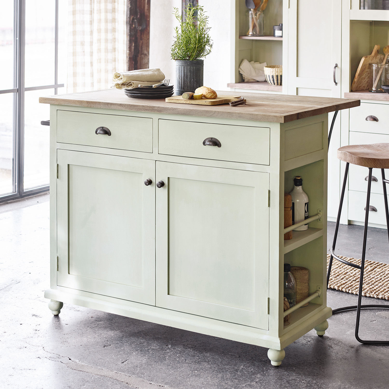 Klar, Küchenmöbel müssen praktisch sein, aber bitte nicht nur. Gerne dürfen sie auch Persönlichkeiten sein, die einem Raum Atmosphäre geben. Diesem Küchenblock gelingt nicht nur der Spagat zwischen Funktion und Aussehen, sondern auch zwischen Tradition und Moderne. Wie aus einer traditionellen Landhaus-Küche entführt lässt dieser Küchenblock mit seinen typischen Profilen und den traditionellen Griffmulden an den Schubladen das Flair vergangener Zeiten wiederaufleben, während die schöne Zweifarbigkeit einen frischen Look ins Küchenambiente bringt. Den Komfort-Ansprüchen des 21. Jahrhunderts kommt er mit seiner zeitgemäßen Arbeitshöhe entgegen, die den Rücken schont. Der Clou aber ist der Barvorsprung an der Arbeitsplatte, der zum schnellen Espresso einlädt, an dem Sie aber auch einen kleinen Mittagsimbiss einnehmen können. Die massive Arbeits- und Barplatte, die ihren warmen Naturholzton zeigen darf, ist aus hochwertigem Mangoholz gefertigt, das eine natürliche Maserung aufweist und sich außerdem durch ausgezeichnete Robustheit und Widerstandsfähigkeit empfiehlt. Neben der Arbeitsfläche bietet Ihnen der Küchenblock aber auch jede Menge Stauraum. Da sind zum einen die zwei praktischen Schubladen, die sich zur Aufbewahrung von Besteck und anderen Kochutensilien eignen. Da sind aber auch die geräumigen Fächer hinter den beiden Türen, in denen perfekt Schüsseln, Töpfe und ähnliches aufbewahrt werden können. Und während auf der einen Seite in den Fächern mit der Reling vielleicht Öl, Essig, Gewürze und Kräuter auf ihren Einsatz warten, können Sie auf der anderen Seite Ihre Küchentücher am Handtuchhalter zum Trocknen aufhängen.