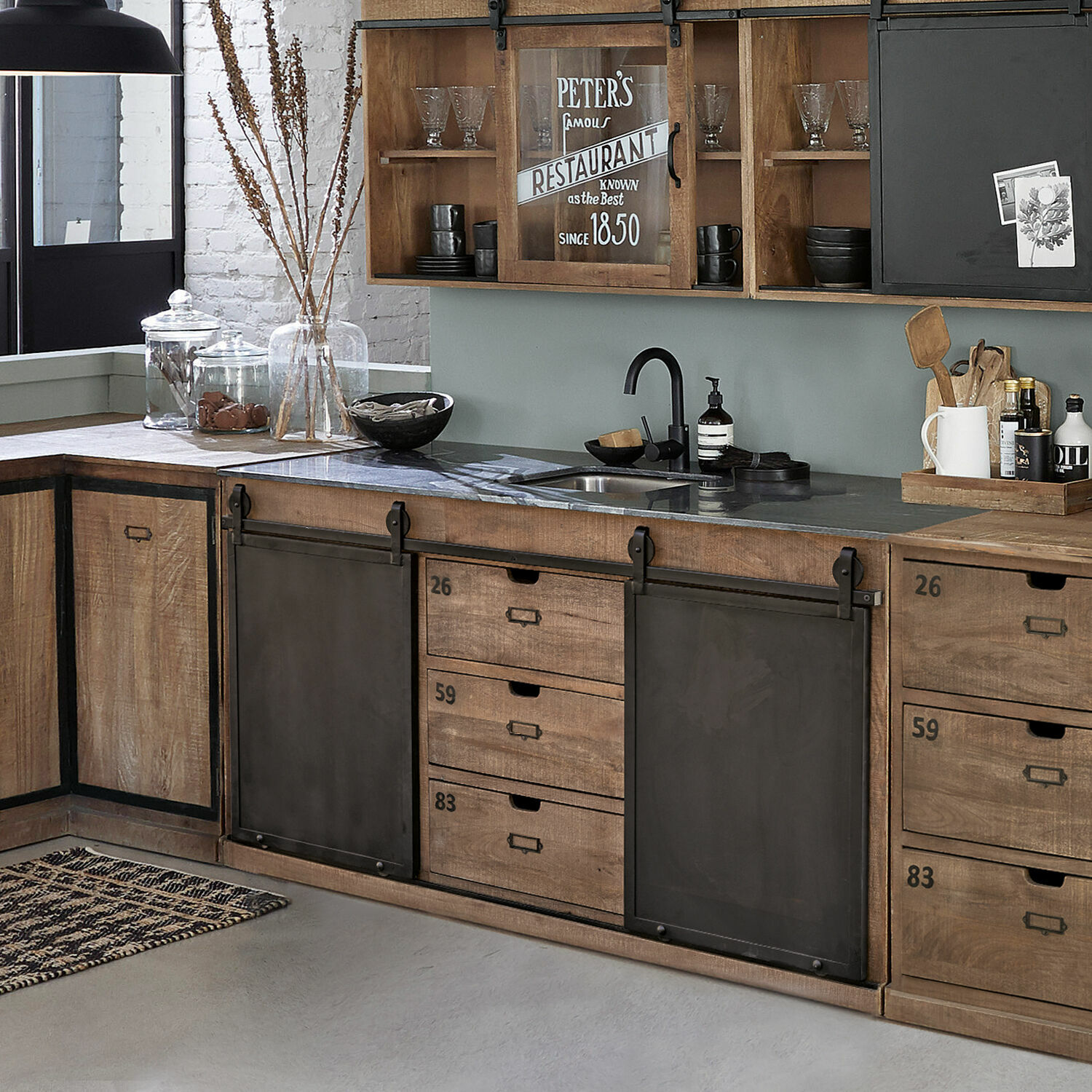 Der Küchenwaschtisch bildet neben dem Herd das Herzstück einer Küche, denn an diesem Platz halten Sie sich wahrscheinlich noch öfter und länger auf als am Herd. Morgens, mittags und abends, 365 Tage im Jahr. Deshalb haben wir an den Entwurf dieses Spültisches auch besonders hohe Anforderungen gestellt, denn er soll Sie optisch, funktional und qualitativ begeistern. Und das viele Jahre lang. Deshalb präsentieren wir Ihnen hier einen charakterstarken Küchenwaschtisch, der einen Hauch von Industrial-Flair in Ihre Küche bringt, ohne die wohnliche Komponente zu vernachlässigen. Die warme Ausstrahlung von massivem Mangoholz erhielt hier durch die sägeraue Oberfläche einen interessant rustikalen Touch und harmoniert so besonders schön mit den Schiebetüren aus massivem Eisen, die typisch für Industrie-Design sind. die Arbeitsplatte aus hochwertigem Naturstein zeigt bei jedem Spültisch ein individuelles Design, was jeden Küchenwaschtisch zu einem Unikat macht. Eingelassen in die Natursteinplatte ist ein Spülbecken aus hochwertigem Edelstahl. Der Küchenwaschtisch kann das stylische Highlight in einer Landhaus- wie in einer Loft-Küche bilden. er kann aber auch zusammen mit anderen Modulen (21163, 21184, 21165, 21166) aus der gleichen Serie zu einer kompletten Küchenzeile (21186) kombiniert werden. Passende Hängeschränke, die Ihre Küche noch vervollständigen, finden Sie ebenfalls bei uns im Shop.