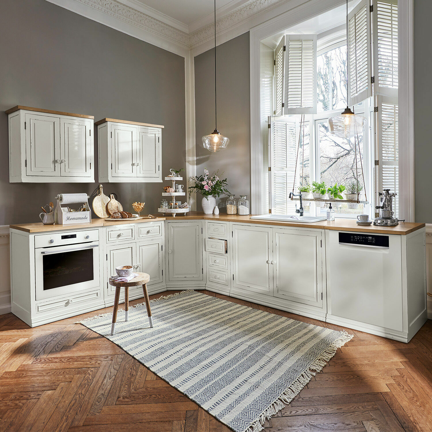 Immer liegt der Duft aromatischer Kräuter in der Luft, die sich an manchen Tagen mit den Bratendüften eines Boeuf Bourguignon, einer Bouillabaisse oder einer Quiche Loraine mischen. während an anderen Tagen die süßen Düfte von Eclairs, Tarte aux Pommes oder einer Charlotte für kurze Zeit die Vorherrschaft übernehmen – es gibt Frankreich-Liebhaber, die sagen, dass sie eine typisch französische Landhaus-Küche an den unverwechselbaren Düften erkennen können. Ja, Kochen und Genießen sind ein Erlebnis für alle Sinne, aber eine gut ausgestattete Küchenzeile ist die Basis dafür. Mit Möbeln, die ausreichend und vielfältigen Stauraum bieten, mit einer robusten Arbeitsfläche und mit Möbelteilen, die auch offen für moderne Küchenhelfer wie Einbaubackofen oder Spülmaschine sind. Hier können wir eine Küchenzeile vorstellen, die mit den klassischen Kassettenprofilen, den typischen Knebelknöpfen und der massivem Arbeitsplatte aus Ulmenholz das bezaubernde Abbild einer traditionellen Landhaus-Küche bietet, die aber die modernen Anforderungen in puncto Flexibilität und Mobilität kennt. Deshalb besteht diese Küchenzeile aus sieben Elementen, die Sie flexibel kombinieren können: aus 1 Unterschrank mit 2 Türen und 2 Schubladen (20662), 1 Eckschrank (20667), 1 Hängeschrank (20671) und 1 Schubladenschrank mit 4 Schubladen (20663). Außerdem aus 1 Spülenschrank mit hochwertiger Keramik-Doppelspüle (20669) sowie 1 Backofenumbau (20666) und 1 Spülmaschinenumbau (20665). An höhenverstellbaren Füßen lässt sich die Arbeitshöhe perfekt anpassen. Liebenswertes Detail sind die dezenten Gebrauchsspuren an den Schränken und Schubladen, als hätte die Küchenzeile schon an einem anderen Ort viel Erfahrung in Sachen französischer Kochkunst erwerben dürfen.