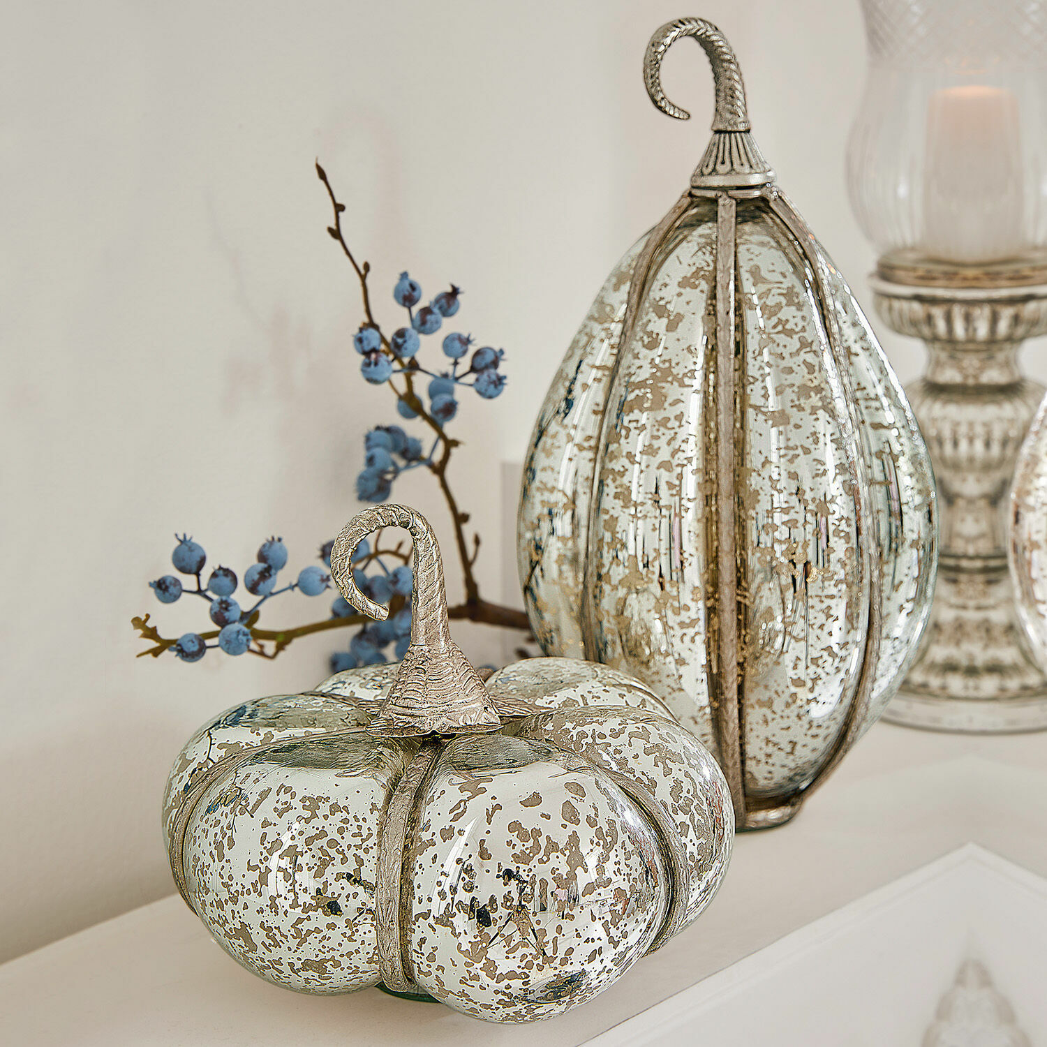 Kürbisse sind nicht nur zum Erntedankfest eine vorzügliche Dekoration, vor allem wenn es sich um so kunstvoll verzierte Modelle wie in diesem Fall handelt. Sie werden aus Glas gefertigt, in einem aufwendigen Prozess antikversilbert und in kunstvolle Fassungen aus reinem Aluminium gebettet. Feine Muster zieren das edle Metall und unterstreichen den hochwertigen Anspruch dieses Sets.