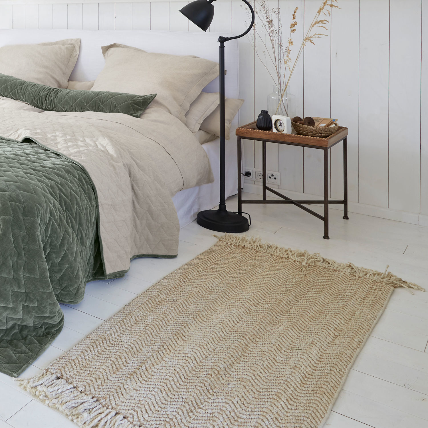 Natur-Look ist Trend. Bei diesem Teppich ist aber nicht nur die Optik natürlich schön, sondern er wurde tatsächlich komplett aus der Naturfaser Jute gefertigt. Was genau ist eigentlich Jute, fragen Sie? Das sind die langen, bastartigen Fasern der tropischen Pflanze Corchorus, die zu groben, robusten Garnen versponnen werden, aus denen auch trendige Wohn-Accessoires hergestellt werden. Dieser Teppich besteht aus einer besonders dichten Webqualität und zeigt ein klassisches Zickzackmuster, das sich mit seinen zurückhaltenden Farbnuancen harmonisch in jedes Ambiente einfügt. Kleine Unebenheiten im Gewebe sind dabei charakteristisch für das ganz traditionell von Hand gefertigte Naturmaterial und machen den besonderen Charme des Teppichs aus. Neben der natürlichen Ästhetik werden Sie aber auch seine praktischen Eigenschaften schätzen. Der Teppich ist außergewöhnlich robust, strapazierfähig und trittfest, sodass er auch in Räumen mit hoher Frequenz wie im Eingangsbereich oder in der Küche eingesetzt werden kann. Er ist aber auch schall- und wärmedämmend sowie antistatisch, weshalb er auch in Schlafräumen wohnliches Flair verbreiten darf. Die sauber verarbeiteten Kanten und die hübschen Fransen machen seinen attraktiven Auftritt perfekt. Und schließlich handelt es sich bei Jute auch um einen nachwachsenden Rohstoff, sodass der Teppich außerdem umweltfreundlich und biologisch abbaubar ist.