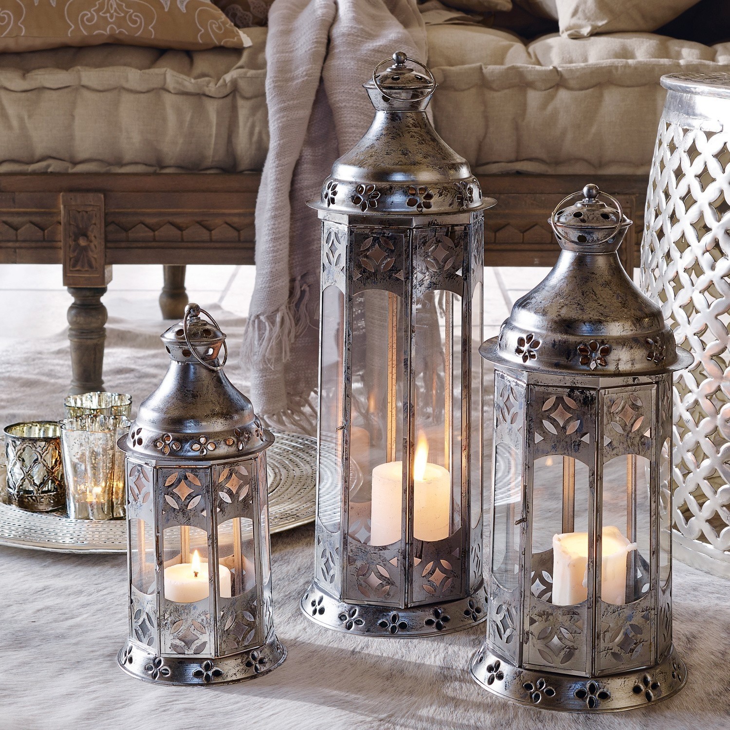 Drei wunderschöne Eisenlaternen, die von Hand hergestellt und mit einem Antiksilber-Finish behandelt wurden. Das orientalisch angehauchte Design begeistert durch […]