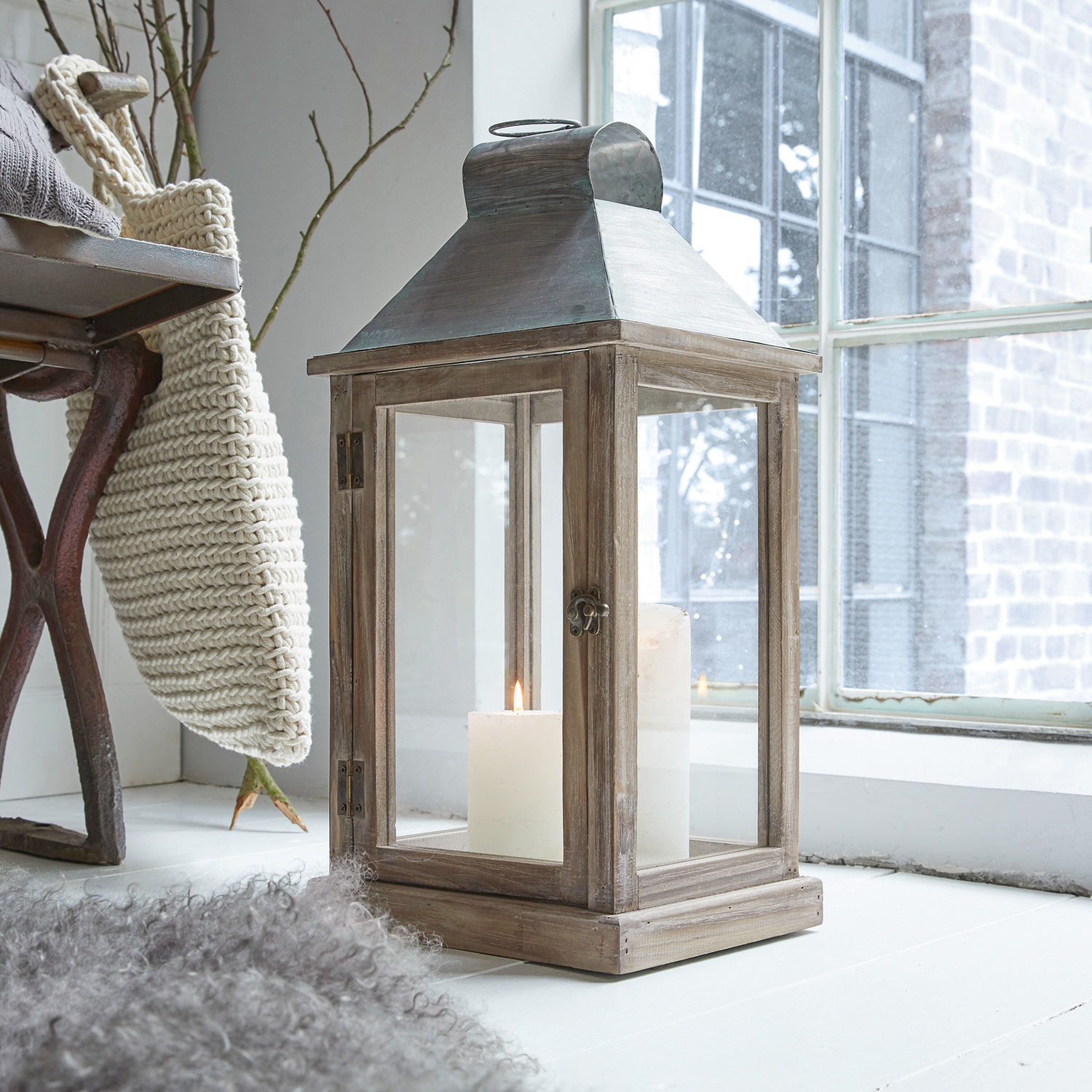 Dank Rundumverglasung ist diese Laterne perfekt für die Präsentation gemusterter und dekorierter Kerzen. Das Gehäuse mit klassisch rustikalem Einschlag ist antiken Originalen nachempfunden und verleiht jedem Raum eine sehr gemütliche und warme Note. Ein hochwertiger Material-Mix aus Tannenholz und Eisen verleiht der Laterne eine natürliche Anmutung, die hervorragend mit der klaren Formsprache kontrastiert. Eine Seite ist mit einem Scharnier sowie einem Schieberegler ausgestattet, damit Sie die Laterne öffnen und bequem mit einer Kerze bestücken können. Natürlich können Sie auch eine LED-Girlande, Muscheln und Perlen oder einen kleinen Kaktus im Innenraum platzieren. Lassen Sie Ihrer Kreativität freien Lauf!