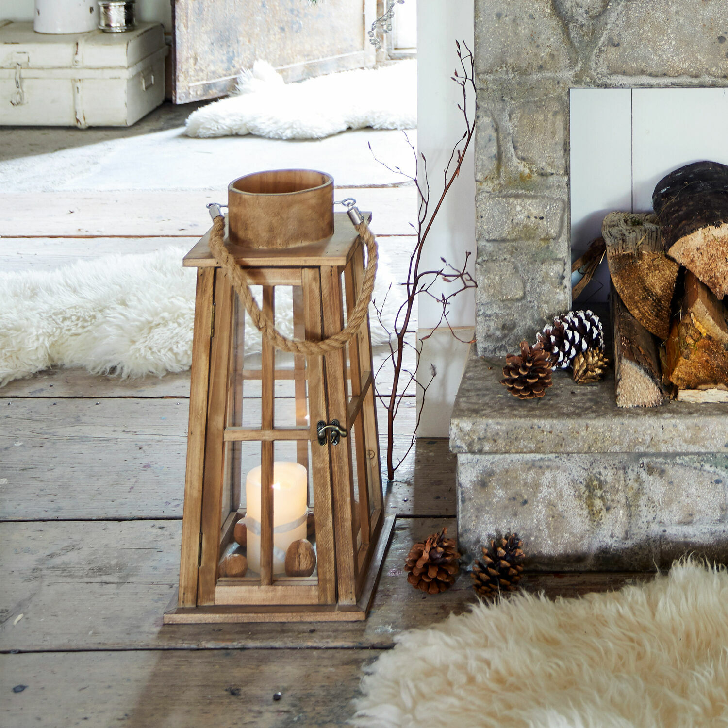 Lassen Sie die Goethe-Zeit in Ihrem Zuhause leuchten: Mit dieser nostalgisch-schönen Laterne erstrahlen vergangene Zeiten in neuem Licht. Ob innerhalb der vier Wände oder auf Ihrer Terrasse – die Laterne bereichert jedes Ambiente. Mit ihrer schicken Sprossenfensteroptik ist der Lichtbringer die perfekte Partie für einen romantischen Landhausstil. Der Glaseinsatz, der Eisenverschluss, das Hanfseil in Kombination mit dem unbehandelten Tannenholz mit seinen natürlichen Maserungen ergeben ein stimmiges Gesamtbild, das in jeder Umgebung zu einem echten Eyecatcher wird. Platzieren Sie kleinere Stumpenkerzen oder Teelichter im Inneren. So kann die Hitze auch gut durch die große Öffnung abziehen und schadet nicht dem Holz. Schaffen Sie sich ihr traumhaftes Licht-Refugium mit Ihren ganz persönlichen Wohlfühlmomenten oder genießen Sie die warme Atmosphäre des Laternenlichts im Kreis Ihrer Familie und Ihren Freundinnen und Freunden.