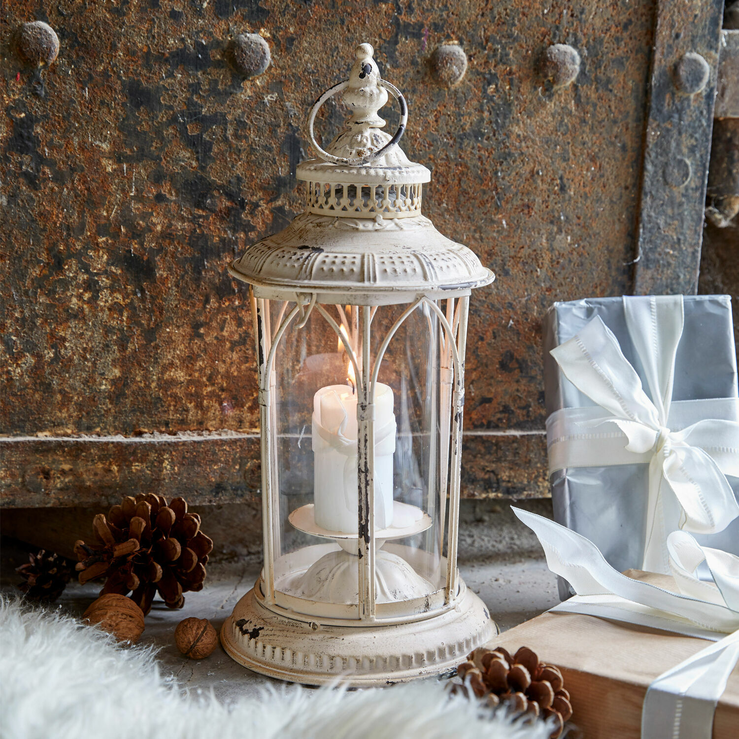 Vintage-Charme pur – diese kunstvolle Laterne ist ein echtes Lieblingsstück für alle, die den Shabby-Look lieben. Sie besteht aus Eisen mit sehr aufwendig aufgebrachtem Antik-Finish und einem Glas-Einsatz, das die Flamme vor Wind schützt. Das stilsichere Design ist sehr dekorativ und charmant. Es adelt wirklich jeden Raum mit einem Hauch Vintage-Flair, vielleicht am Fenster oder auf dem Boden platziert. Entzünden Sie darin ein Teelicht oder eine Stumpenkerze und erleben Sie eine geborgene, heimelige Atmosphäre, die das ganze Jahr über ein Genuss ist. An dem Ring oben lässt die formschöne Laterne sich sehr einfach verstellen oder auch aufhängen. Schmücken Sie den Tisch, eine Anrichte oder auch den Fußboden damit und entscheiden Sie nur noch, welcher Raum sich auf dieses nostalgische Accessoire freuen darf – der Flur, das Schlafzimmer oder doch die Wohnräume?