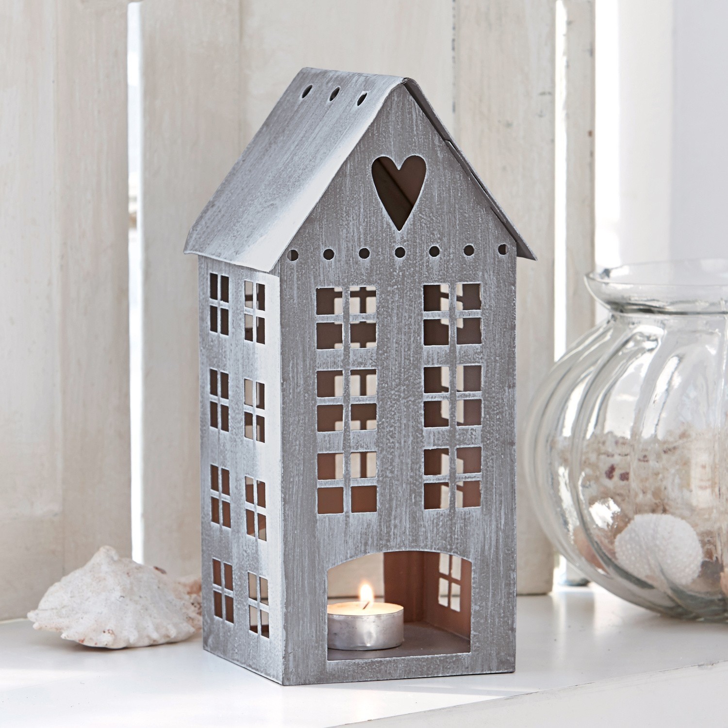 Eine pfiffige Laterne, die einem Haus nachempfunden wurde. Im zarten Kindesalter hat man so etwas noch aus Pappe und Transparentpapier gebastelt. Dieses Exemplar ist aber komplett aus Metall gefertigt, mit Fenstern, einer Tür und hinreißenden Details ausgestattet. Sogar ein kleines Herz findet sich in der ‘Fassade’. Einfach eine Kerze hineinstellen und am tollen Lichtspiel erfreuen! Eine besonders tolle Wirkung entfaltet die Laterne in Verbindung mit anderen Deko-Objekten. Zum Beispiel als Zentrum eines Adventskranzes.