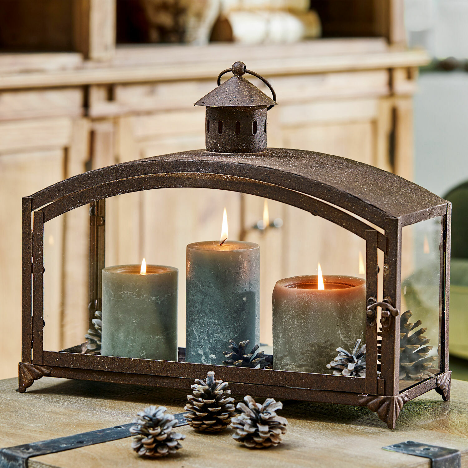 Wie ein antikes Stück wirkt diese schöne Laterne aus Eisen und Glas. Dazu trägt auch das stilechte Finish bei, das auf attraktive Weise an Rost-Effekte erinnert. Die im oberen Teil harmonisch geschwungene Form mit einem Tragegriff wirkt sehr harmonisch. Ob in Innenräumen oder auf dem Balkon, der Terrasse oder im Garten: Stellen Sie eine oder mehrere Kerzen oder Teelichter hinein und erfreuen Sie sich an heimeligen und stilvollen Lichtspielen. Hinter Glas ist die Flamme vor Wind geschützt, was den Outdoor-Gebrauch erleichtert. Mit einem Verschluss lässt die vordere Glasfront sich öffnen und schließen. An warmen Sommerabenden bei einem kühlen Gläschen Wein im Garten ein wunderbar stimmungsvolles Accessoire, das einen Hauch Romantik in jedes Ambiente zaubert. In jeder Jahreszeit ideal nutzbar, denn warmer Kerzenschein hat immer Saison. Ein Stück mit antikem Charakter, das sich in jedes Ambiente perfekt einfügt