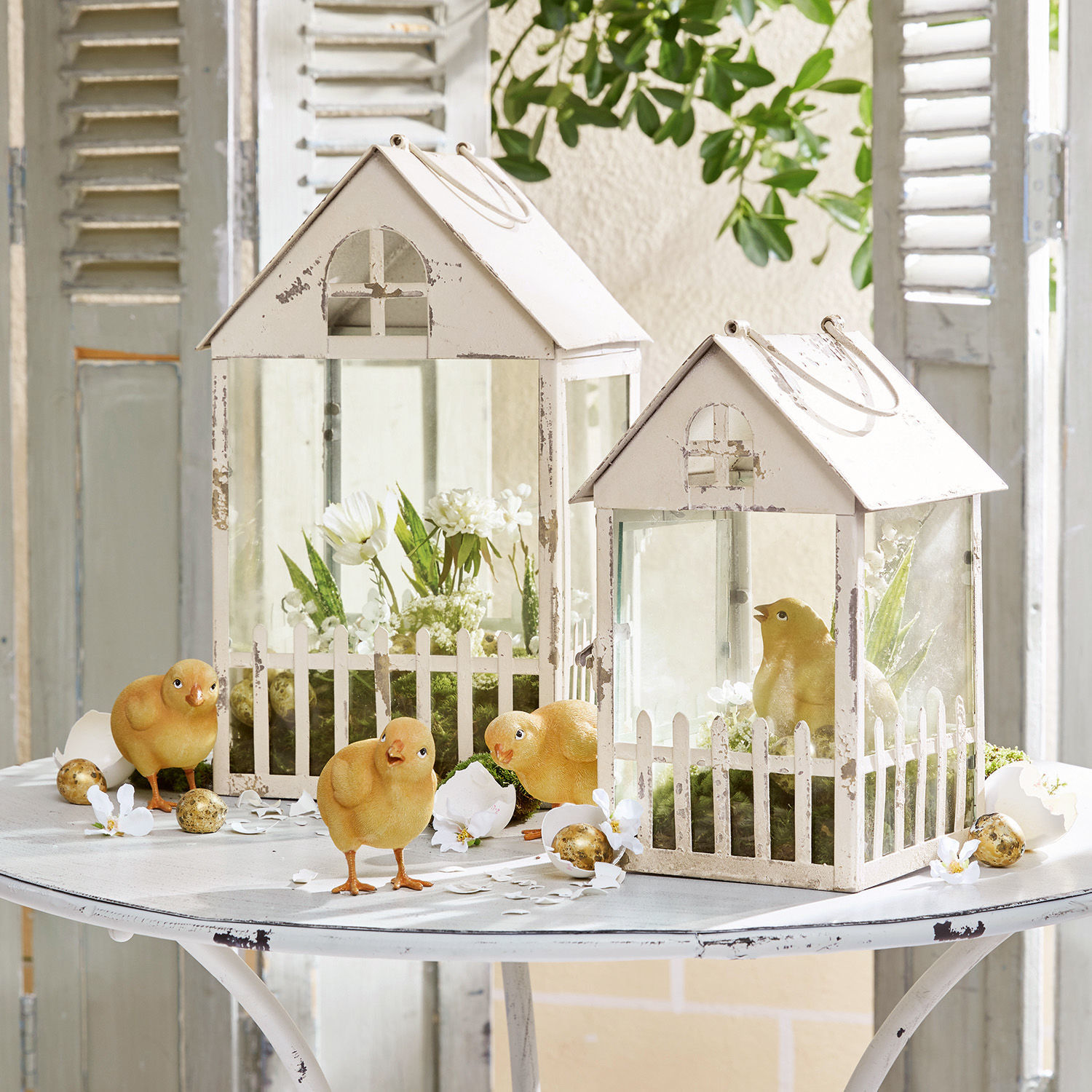 Es ist einfach toll, wenn Accessoires nicht nur hübsch aussehen, sondern auch unsere Kreativität beflügeln. Dieses zweiteilige Laternen-Set ist in dieser Hinsicht besonders vielseitig, denn jedes Stück funktioniert für sich alleine ganz wunderbar – zum Beispiel als Laterne, die mit einer Kerze oder LED-Leuchtmitteln bestückt wird. Ebenso gut lassen sich die Schmuckstücke aber auch gemeinsam als Highlight der Frühlingsdekoration nutzen. Sie können mit Blumen oder getrockneten Blättern befüllt werden. Ihrer Kreativität sind hier wirklich keine Grenzen gesetzt. Jede der Laternen wird aus robustem Eisen gefertigt und sorgfältig verglast. Raffinierte Details: Ein Türchen, das sich mit einem kleinen Hebel öffnen lässt und ein kleiner Lattenzaun, der den unteren Teil der Laternen umgibt. Ein handgearbeitetes Shabby-Finish verleiht den Stücken ihren charmanten Vintage-Look. Das hat Charme und Unikat-Charakter!