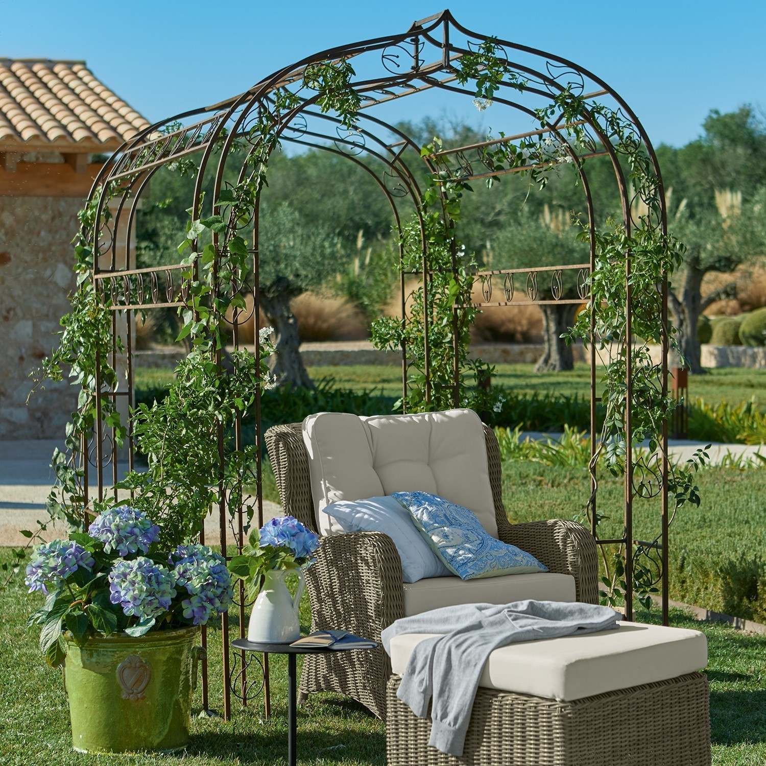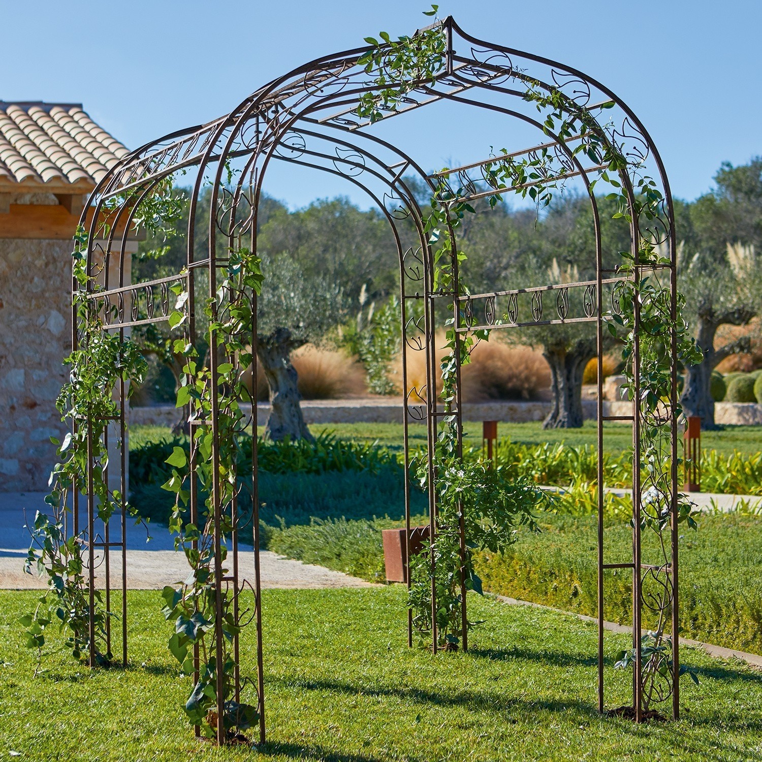Romantik pur kommt mit diesem wunderhübschen und großzügigen Laubengang aus Eisen in Ihren Garten. Das attraktiv geschwungene Design ist detailreich verziert und verzaubert mit einem authentischen Rost-Finish, welches ihm einen feinen Vintage-Charakter verleiht. Einfach ideal für die romantische Gartengestaltung. Mit Kletterpflanzen oder duftenden Rosen begrünt wirkt der eiserne Laubengang noch schöner. Freuen Sie sich über diesen reizenden Akzent in Ihrem Garten und genießen Sie wunderbare und verträumte Stunden im Grünen.