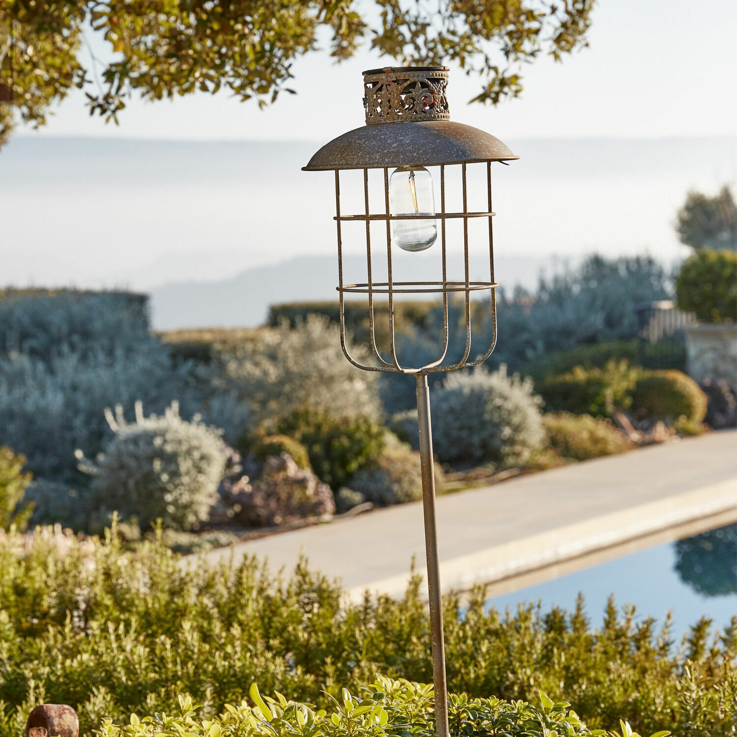 Ein wahres Multitalent mit vielen Vorzügen kommt in Form dieser stilvollen Gartenlaterne zu Ihnen. Sie besteht aus kunstvoll verziertem Eisen und wird mit einem LED-Leuchtmittel heimelig erleuchtet. Erleben Sie eine sehr flexibel nutzbare Lichtquelle, die problemlos jeden Winkel des Gartens erleuchten kann. Sie sind hiermit ganz unabhängig von Strom und Steckdose. Da sie mit Batterien betrieben wird, kann die geschmackvolle Laterne frei überall aufgestellt werden – einfach in die Erde stecken, und schon ist sie einsatzbereit. Rasen oder Beet freuen sich über diesen attraktiven Schmuck, und auch Terrasse oder Balkon lassen sich mit dem edlen Accessoire erleuchten, wenn Sie den Erdspieß in einen stabilen Topf mit Erde stecken. Genießen Sie Ihr grünes Refugium hiermit zu jeder Tageszeit in vollen Zügen.
