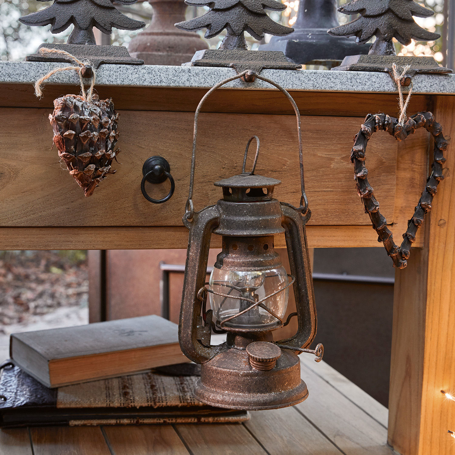 Romantisch-verwunschener Vintage-Charme. Die wunderschöne Laterne aus Eisen mit klaren Glaseinsätzen hat ein gekonntes Antik-Finish, welches ihr eine reizende Patina verleiht. So passt sie perfekt zum Shabby-Chic. Das warmweiße LED-Leuchtmittel ist bereits integriert und illuminiert Ihr Zuhause sehr gemütlich und setzt einen heimeligen Akzent. Dank unkompliziertem Batteriebetrieb ist die Laterne wirklich überall ganz flexibel nutzbar, völlig ohne Kabelsalat und Steckdose. Am schicken Henkel lässt sie sich auch aufhängen, vielleicht an einem Pfosten, Bettgestell oder Haken. Oder stellen Sie sie ganz klassisch auf. Hiermit gelingt Ihnen ein schmeichelnder Effekt, der Ihre Indoor-Räume besonders kuschelig macht. Auch auf dem Fensterbrett oder als freundlicher Gruß an der Tür im Treppenhaus beweisen Sie mit der attraktiven Laterne Stil. Freuen Sie sich das ganze Jahr über auf einen authentisch-historischen Akzent der gedanklich in frühere Zeiten entführt. Zu jedem Wohnstil ist sie ein absolut gelungenes Accessoire, das eine Extraportion Charme in jeden Raum zaubert. Gerade eine gedimmte Beleuchtung aus diversen kleinen Lichtquellen macht es besonders leicht, sich zu Hause so richtig vom Alltag zu entspannen.